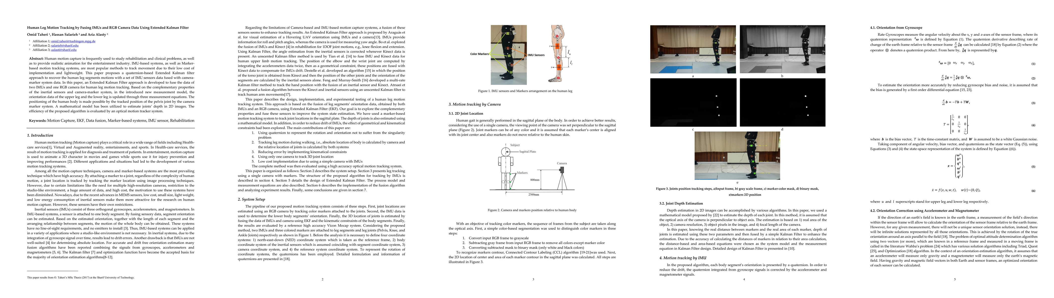 This paper proposes a quaternion-based Extended Kalman Filter to fuse data from inertial measurement units (IMUs) and an RGB camera to track human leg motion. The method combines the strengths of IMUs and camera-marker systems to improve accuracy and efficiency in motion capture for rehabilitation and entertainment.