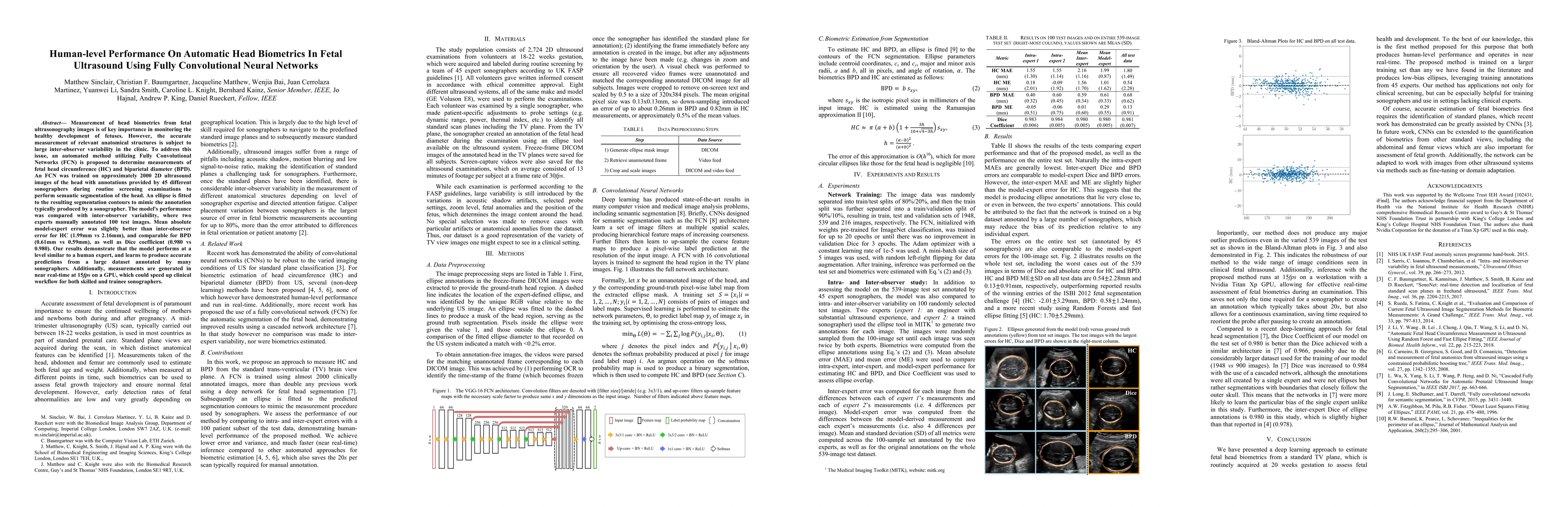 This research proposes an automated method using Fully Convolutional Networks (FCN) to accurately measure fetal head circumference and biparietal diameter from ultrasound images, achieving performance comparable to human experts and reducing inter-observer variability. The model processes images at 15fps, potentially speeding up clinical workflows.