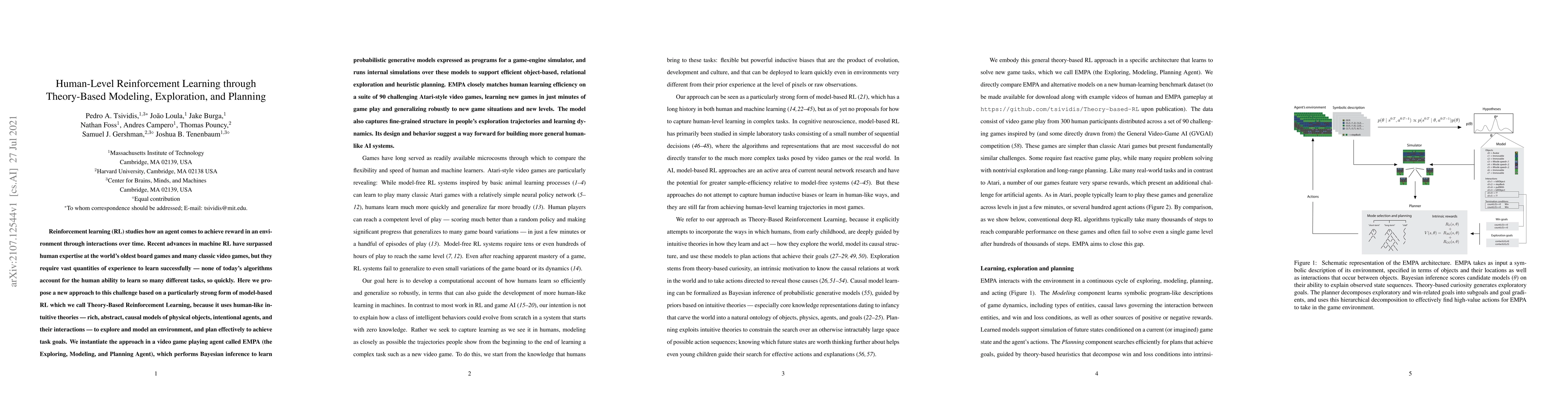 This paper proposes a novel Theory-Based Reinforcement Learning approach that leverages human-like intuitive theories to efficiently explore and model environments, achieving human-level learning efficiency in video games. The EMPA agent uses Bayesian inference to learn generative models and internal simulations to plan effectively, matching human learning speed on a suite of Atari-style games.