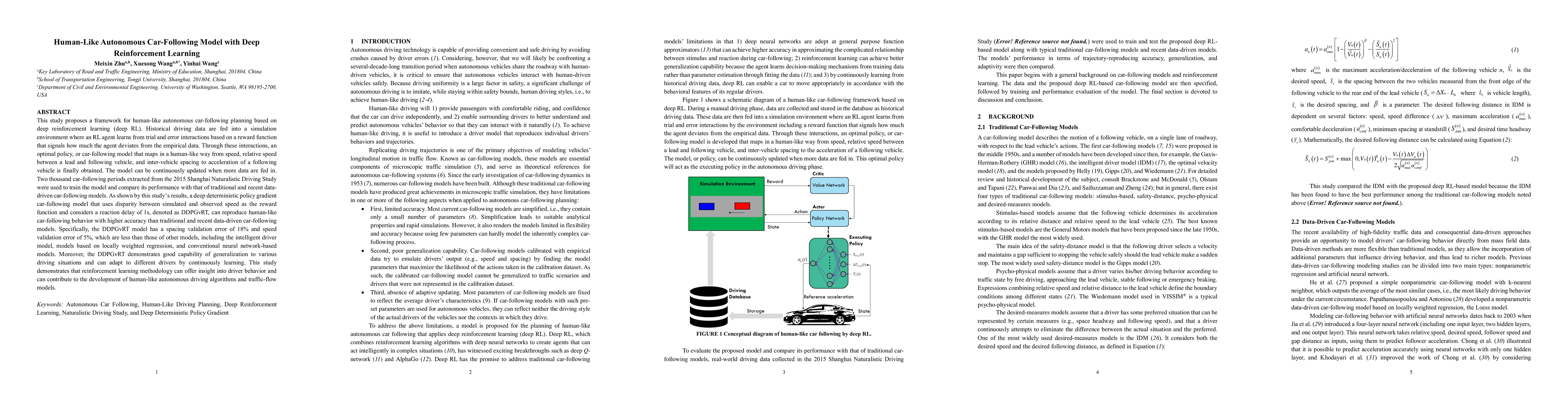 This study develops a human-like autonomous car-following model using deep reinforcement learning, achieving higher accuracy than traditional models by learning from historical driving data. The DDPGvRT model shows superior performance with lower validation errors and better generalization.