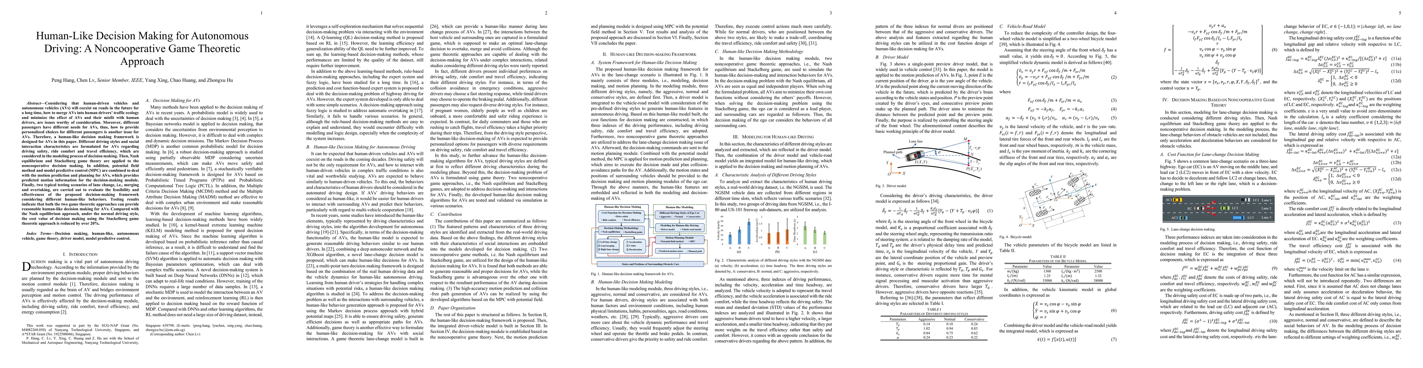 Considering that human-driven vehicles and autonomous vehicles (AVs) will coexist on roads in the future for a long time, how to merge AVs into human drivers traffic ecology and minimize the effect of AVs and their misfit with human drivers, are issues worthy of consideration. Moreover, different passengers have different needs for AVs, thus, how to provide personalized choices for different passengers is another issue for AVs. Therefore, a human-like decision making framework is designed for AVs in this paper. Different driving styles and social interaction characteristics are formulated for AVs regarding driving safety, ride comfort and travel efficiency, which are considered in the modeling process of decision making. Then, Nash equilibrium and Stackelberg game theory are applied to the noncooperative decision making. In addition, potential field method and model predictive control (MPC) are combined to deal with the motion prediction and planning for AVs, which provides predicted motion information for the decision-making module. Finally, two typical testing scenarios of lane change, i.e., merging and overtaking, are carried out to evaluate the feasibility and effectiveness of the proposed decision-making framework considering different human-like behaviors. Testing results indicate that both the two game theoretic approaches can provide reasonable human-like decision making for AVs. Compared with the Nash equilibrium approach, under the normal driving style, the cost value of decision making using the Stackelberg game theoretic approach is reduced by over 20%.
