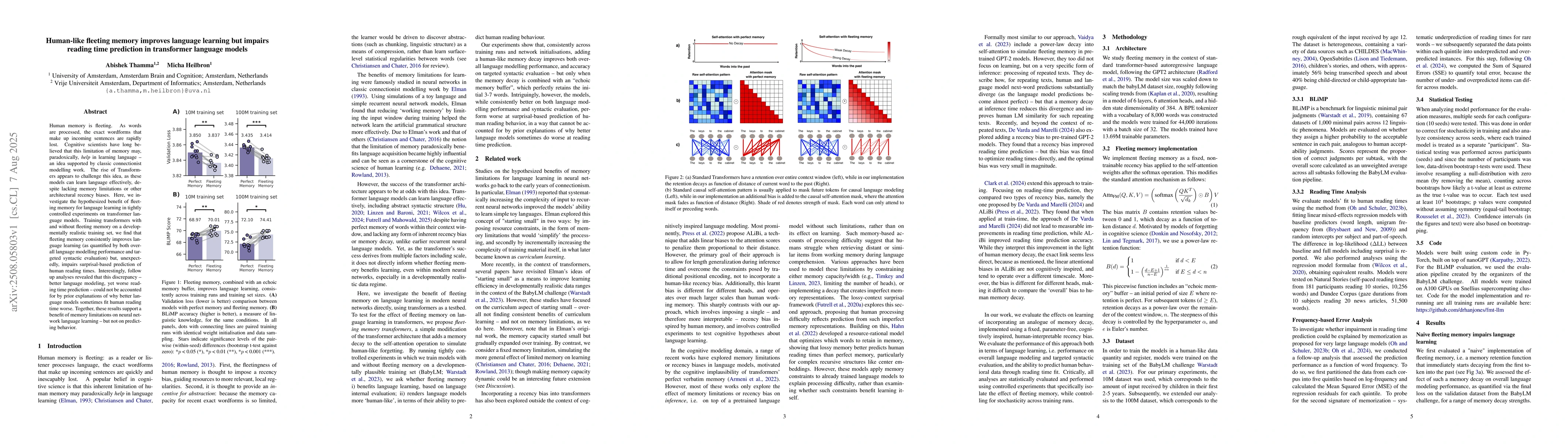 Human memory is fleeting. As words are processed, the exact wordforms that make up incoming sentences are rapidly lost. Cognitive scientists have long believed that this limitation of memory may, paradoxically, help in learning language - an idea supported by classic connectionist modelling work. The rise of Transformers appears to challenge this idea, as these models can learn language effectively, despite lacking memory limitations or other architectural recency biases. Here, we investigate the hypothesized benefit of fleeting memory for language learning in tightly controlled experiments on transformer language models. Training transformers with and without fleeting memory on a developmentally realistic training set, we find that fleeting memory consistently improves language learning (as quantified by both overall language modelling performance and targeted syntactic evaluation) but, unexpectedly, impairs surprisal-based prediction of human reading times. Interestingly, follow up analyses revealed that this discrepancy - better language modeling, yet worse reading time prediction - could not be accounted for by prior explanations of why better language models sometimes fit human reading time worse. Together, these results support a benefit of memory limitations on neural network language learning - but not on predicting behavior.