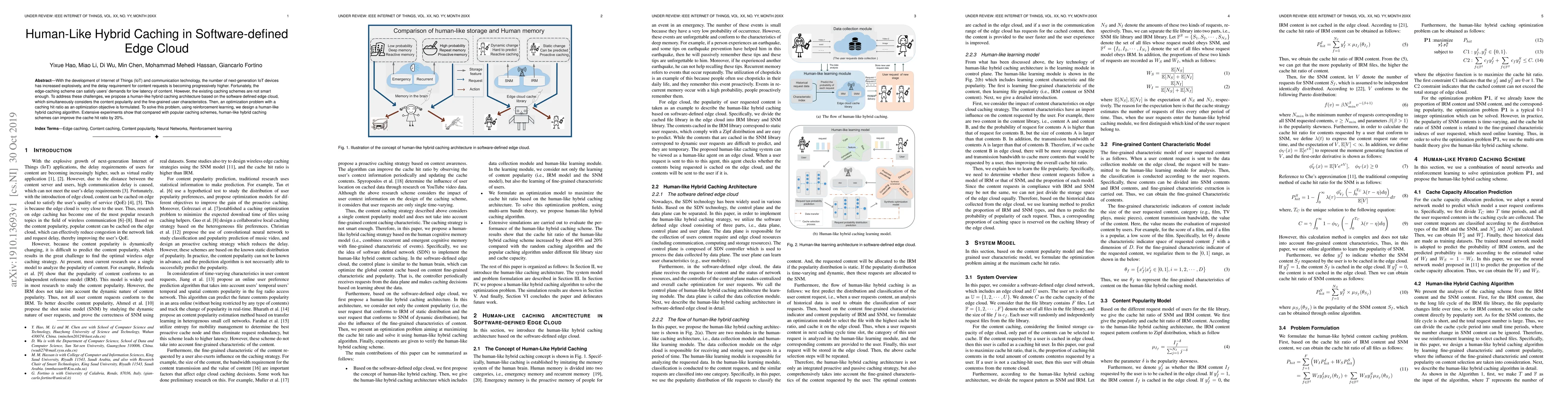 This paper proposes a human-like hybrid caching architecture for software-defined edge clouds to meet the high latency demands of IoT devices. The proposed caching algorithm, based on reinforcement learning, optimizes the caching hit ratio by considering content popularity and user characteristics, achieving a 20% improvement over existing schemes.