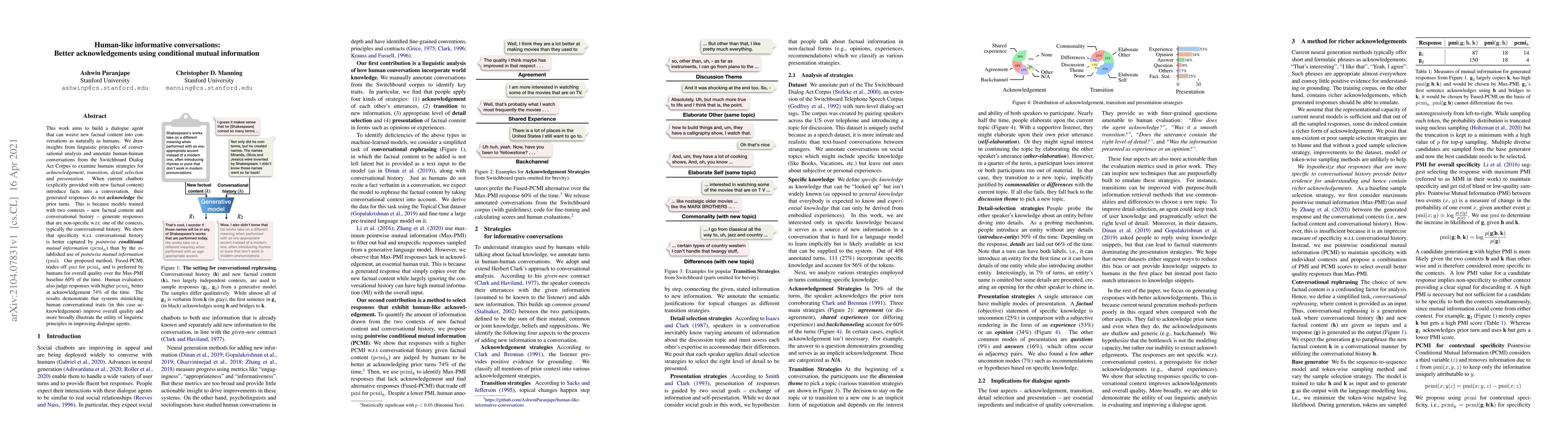 This work aims to build a dialogue agent that can weave new factual content into conversations as naturally as humans. We draw insights from linguistic principles of conversational analysis and annotate human-human conversations from the Switchboard Dialog Act Corpus to examine humans strategies for acknowledgement, transition, detail selection and presentation. When current chatbots (explicitly provided with new factual content) introduce facts into a conversation, their generated responses do not acknowledge the prior turns. This is because models trained with two contexts - new factual content and conversational history - generate responses that are non-specific w.r.t. one of the contexts, typically the conversational history. We show that specificity w.r.t. conversational history is better captured by Pointwise Conditional Mutual Information ($\text{pcmi}_h$) than by the established use of Pointwise Mutual Information ($\text{pmi}$). Our proposed method, Fused-PCMI, trades off $\text{pmi}$ for $\text{pcmi}_h$ and is preferred by humans for overall quality over the Max-PMI baseline 60% of the time. Human evaluators also judge responses with higher $\text{pcmi}_h$ better at acknowledgement 74% of the time. The results demonstrate that systems mimicking human conversational traits (in this case acknowledgement) improve overall quality and more broadly illustrate the utility of linguistic principles in improving dialogue agents.