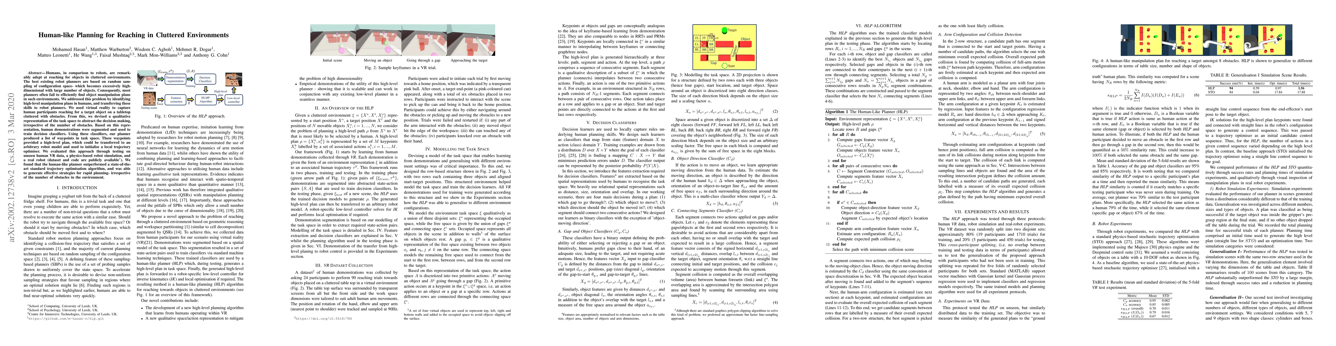 This research proposes a human-like planning method for robots to navigate cluttered environments by emulating human reaching strategies. Using virtual reality to capture human actions, the authors develop a qualitative task space representation and use human demonstrations to train classifiers, which generate high-level plans for robots to follow. The method outperformed standard trajectory optimisation in tests, demonstrating effective rapid planning in various cluttered settings.