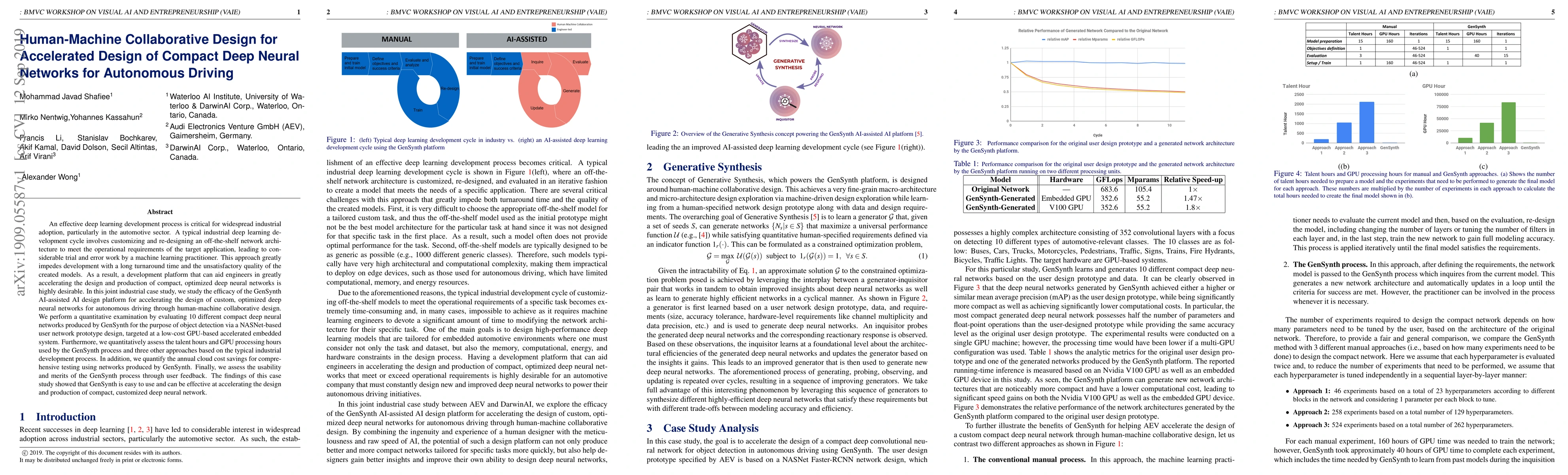 An effective deep learning development process is critical for widespread industrial adoption, particularly in the automotive sector. A typical industrial deep learning development cycle involves customizing and re-designing an off-the-shelf network architecture to meet the operational requirements of the target application, leading to considerable trial and error work by a machine learning practitioner. This approach greatly impedes development with a long turnaround time and the unsatisfactory quality of the created models. As a result, a development platform that can aid engineers in greatly accelerating the design and production of compact, optimized deep neural networks is highly desirable. In this joint industrial case study, we study the efficacy of the GenSynth AI-assisted AI design platform for accelerating the design of custom, optimized deep neural networks for autonomous driving through human-machine collaborative design. We perform a quantitative examination by evaluating 10 different compact deep neural networks produced by GenSynth for the purpose of object detection via a NASNet-based user network prototype design, targeted at a low-cost GPU-based accelerated embedded system. Furthermore, we quantitatively assess the talent hours and GPU processing hours used by the GenSynth process and three other approaches based on the typical industrial development process. In addition, we quantify the annual cloud cost savings for comprehensive testing using networks produced by GenSynth. Finally, we assess the usability and merits of the GenSynth process through user feedback. The findings of this case study showed that GenSynth is easy to use and can be effective at accelerating the design and production of compact, customized deep neural network.