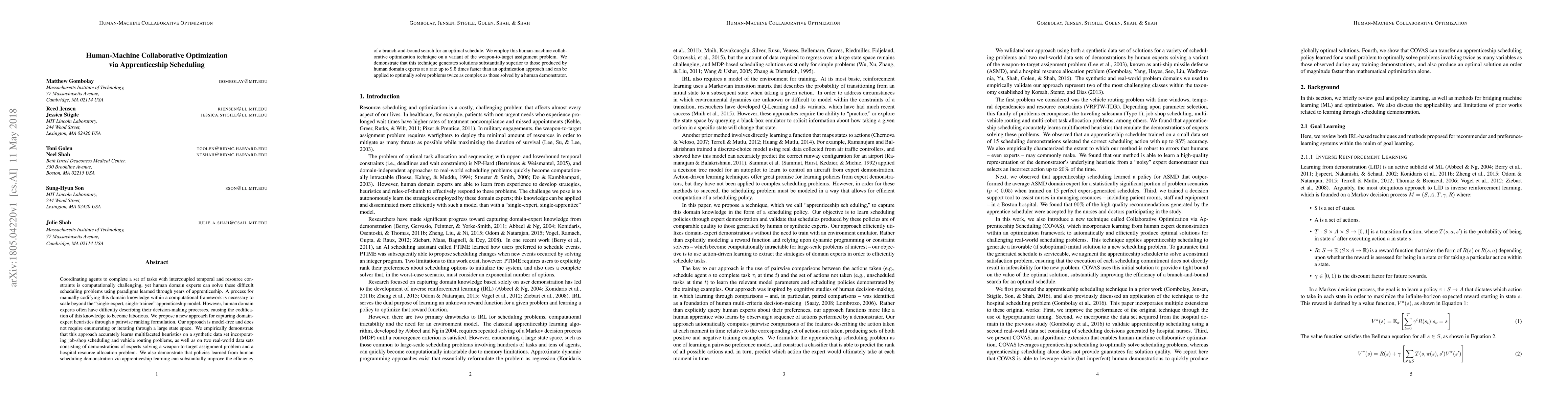 Coordinating agents to complete a set of tasks with intercoupled temporal and resource constraints is computationally challenging, yet human domain experts can solve these difficult scheduling problems using paradigms learned through years of apprenticeship. A process for manually codifying this domain knowledge within a computational framework is necessary to scale beyond the ``single-expert, single-trainee" apprenticeship model. However, human domain experts often have difficulty describing their decision-making processes, causing the codification of this knowledge to become laborious. We propose a new approach for capturing domain-expert heuristics through a pairwise ranking formulation. Our approach is model-free and does not require enumerating or iterating through a large state space. We empirically demonstrate that this approach accurately learns multifaceted heuristics on a synthetic data set incorporating job-shop scheduling and vehicle routing problems, as well as on two real-world data sets consisting of demonstrations of experts solving a weapon-to-target assignment problem and a hospital resource allocation problem. We also demonstrate that policies learned from human scheduling demonstration via apprenticeship learning can substantially improve the efficiency of a branch-and-bound search for an optimal schedule. We employ this human-machine collaborative optimization technique on a variant of the weapon-to-target assignment problem. We demonstrate that this technique generates solutions substantially superior to those produced by human domain experts at a rate up to 9.5 times faster than an optimization approach and can be applied to optimally solve problems twice as complex as those solved by a human demonstrator.
