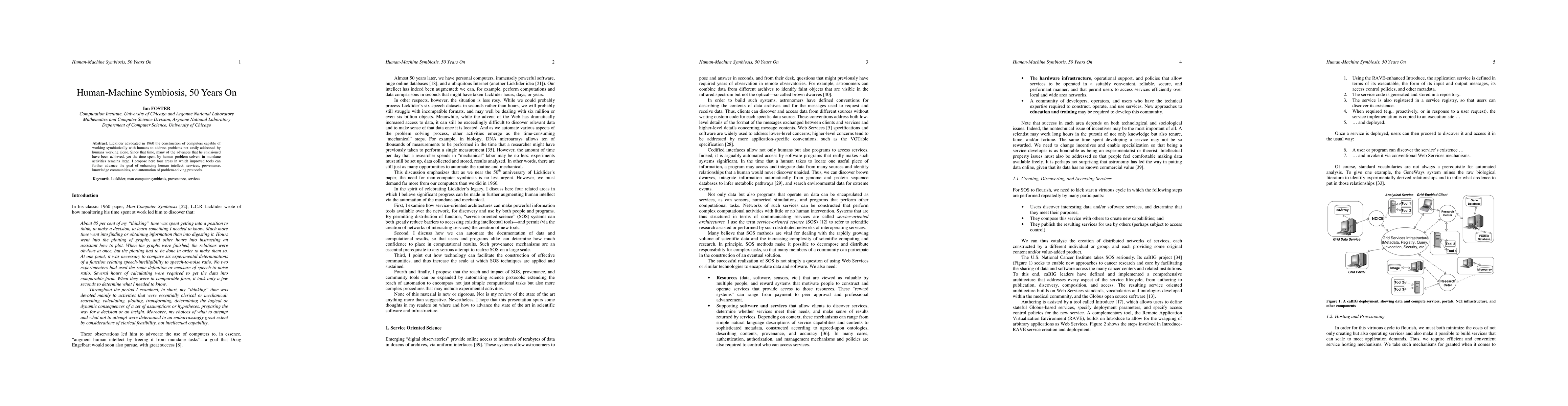 The paper reflects on Licklider's 1960 vision of human-computer symbiosis, noting progress in areas like problem-solving. It proposes enhancing human intellect further through improved tools in services, provenance, knowledge communities, and automation of problem-solving protocols.