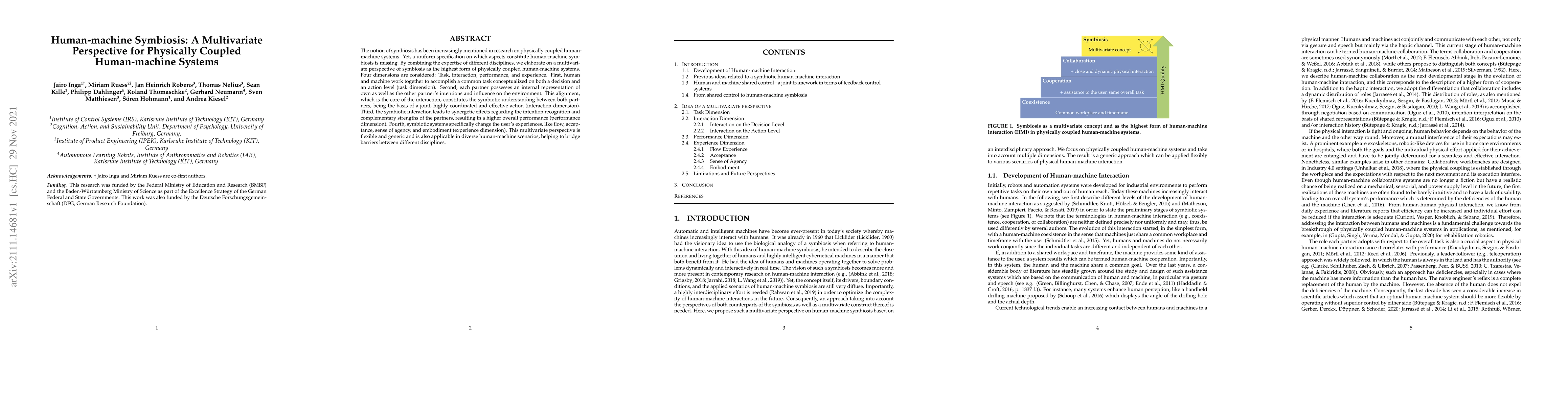The notion of symbiosis has been increasingly mentioned in research on physically coupled human-machine systems. Yet, a uniform specification on which aspects constitute human-machine symbiosis is missing. By combining the expertise of different disciplines, we elaborate on a multivariate perspective of symbiosis as the highest form of physically coupled human-machine systems. Four dimensions are considered: Task, interaction, performance, and experience. First, human and machine work together to accomplish a common task conceptualized on both a decision and an action level (task dimension). Second, each partner possesses an internal representation of own as well as the other partner's intentions and influence on the environment. This alignment, which is the core of the interaction, constitutes the symbiotic understanding between both partners, being the basis of a joint, highly coordinated and effective action (interaction dimension). Third, the symbiotic interaction leads to synergetic effects regarding the intention recognition and complementary strengths of the partners, resulting in a higher overall performance (performance dimension). Fourth, symbiotic systems specifically change the user's experiences, like flow, acceptance, sense of agency, and embodiment (experience dimension). This multivariate perspective is flexible and generic and is also applicable in diverse human-machine scenarios, helping to bridge barriers between different disciplines.