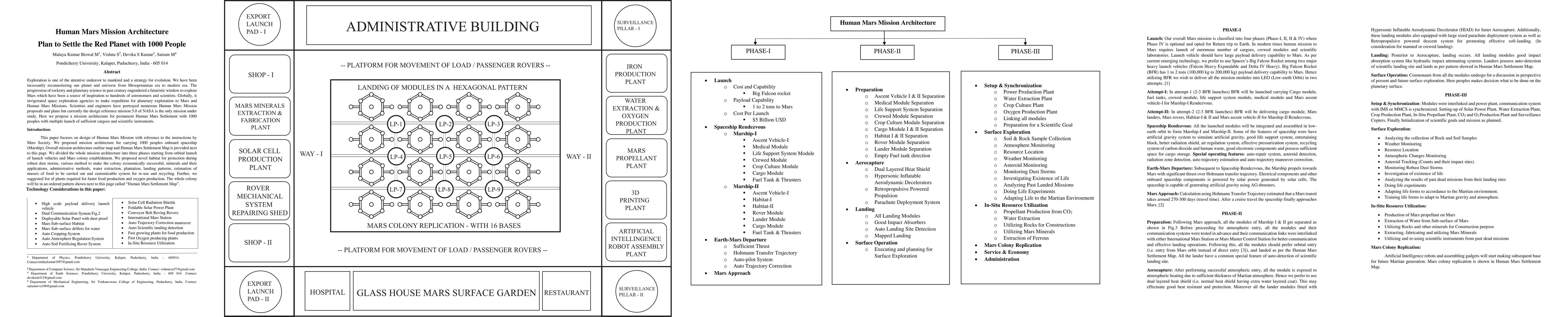 Exploration is one of the attentive endeavor to mankind and a strategy for evolution. We have been incessantly reconnoitering our planet and universe from Mesopotamian era to modern era. The progression of rocketry and planetary science in past century engendered a futuristic window to explore Mars which have been a source of inspiration to hundreds of astronomers and scientists. Globally, it invigorated space exploration agencies to make expedition for planetary exploration to Mars and Human Mars Missions. Scientists and engineers have portrayed numerous Human Mars Mission proposals and plans but currently the design reference mission 5.0 of NASA is the only mission under study. Here we propose a mission architecture for permanent Human Mars Settlement with 1000 peoples with multiple launch of sufficient cargoes and scientific instruments