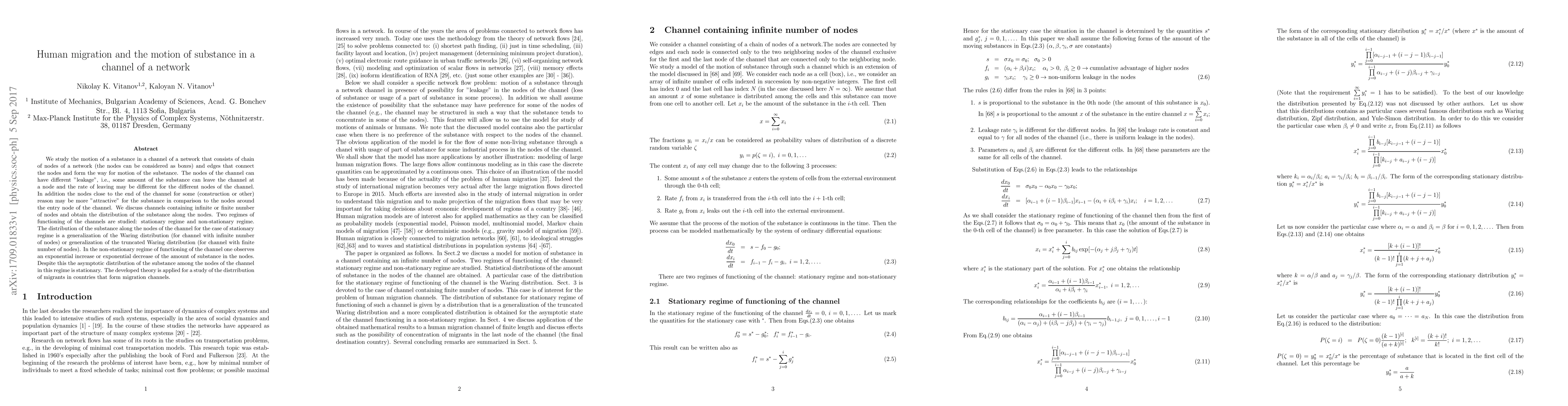 We study the motion of a substance in a channel of a network that consists of chain of nodes of a network (the nodes can be considered as boxes) and edges that connect the nodes and form the way for motion of the substance. The nodes of the channel can have different "leakage", i.e., some amount of the substance can leave the channel at a node and the rate of leaving may be different for the different nodes of the channel. In addition the nodes close to the end of the channel for some (construction or other) reason may be more "attractive" for the substance in comparison to the nodes around the entry node of the channel. We discuss channels containing infinite or finite number of nodes and obtain the distribution of the substance along the nodes. Two regimes of functioning of the channels are studied: stationary regime and non-stationary regime. The distribution of the substance along the nodes of the channel for the case of stationary regime is a generalization of the Waring distribution (for channel with infinite number of nodes) or generalization of the truncated Waring distribution (for channel with finite number of nodes). In the non-stationary regime of functioning of the channel one observes an exponential increase or exponential decrease of the amount of substance in the nodes. Despite this the asymptotic distribution of the substance among the nodes of the channel in this regime is stationary. The developed theory is applied for a study of the distrribution of migrants in countries that form migration channels.