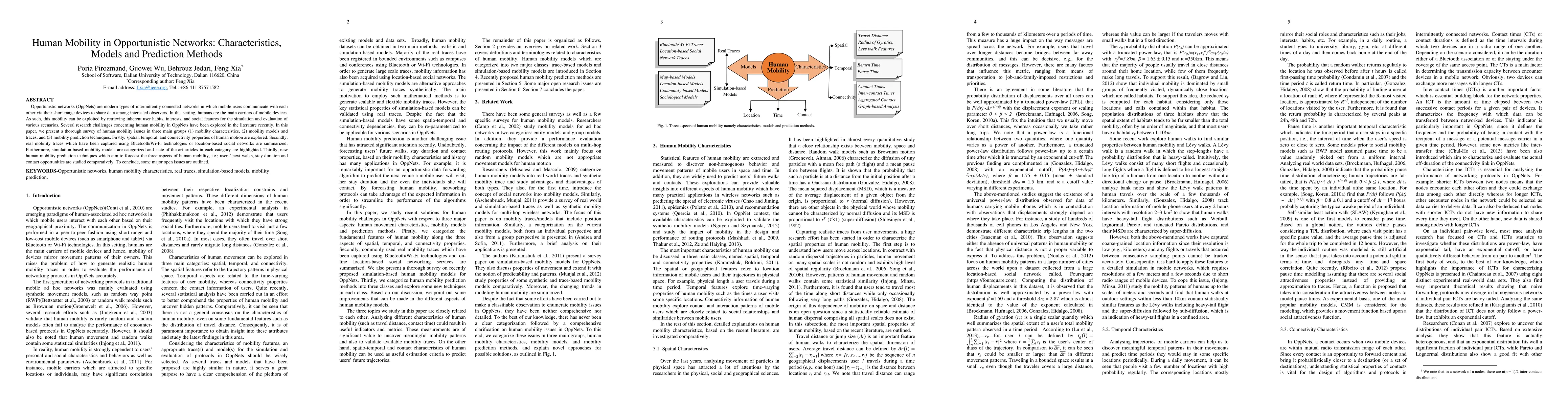This paper surveys human mobility in opportunistic networks, categorizing it into mobility characteristics, models, and prediction methods. It explores spatial, temporal, and connectivity properties, summarizes real mobility traces, and reviews simulation-based models, concluding with comparative analysis of mobility prediction techniques.