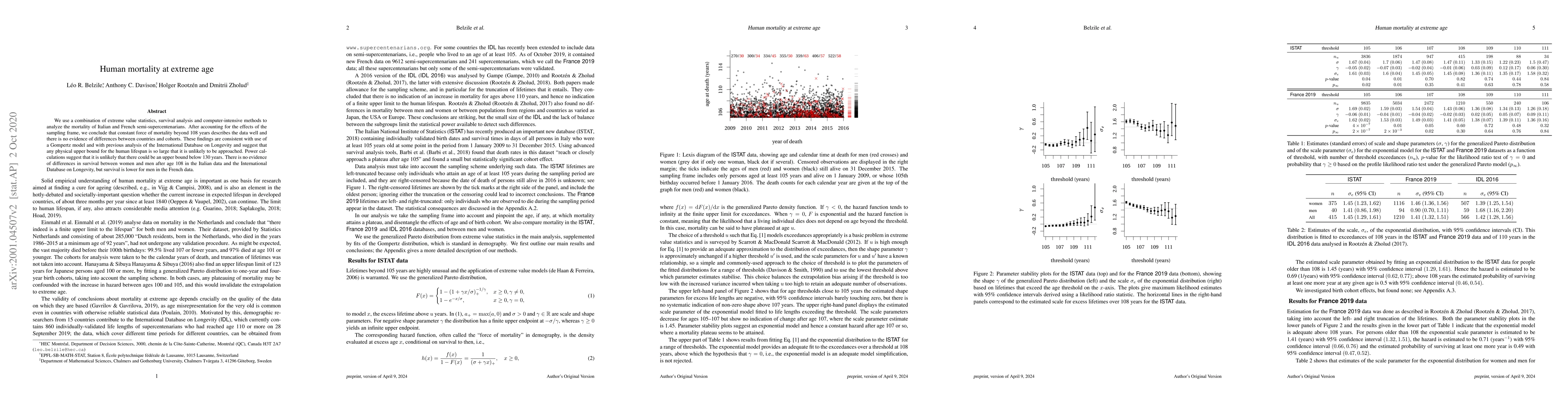 We use a combination of extreme value theory, survival analysis and computer-intensive methods to analyze the mortality of Italian and French semi-supercentenarians for whom there are validated records. After accounting for the effects of the sampling frame, there appears to be a constant rate of mortality beyond age 108 years and no difference between countries and cohorts. These findings are consistent with previous work based on the International Database on Longevity and suggest that any physical upper bound for humans is so large that it is unlikely to be approached. There is no evidence of differences in survival between women and men after age 108 in the Italian data and the International Database on Longevity; however survival is lower for men in the French data.