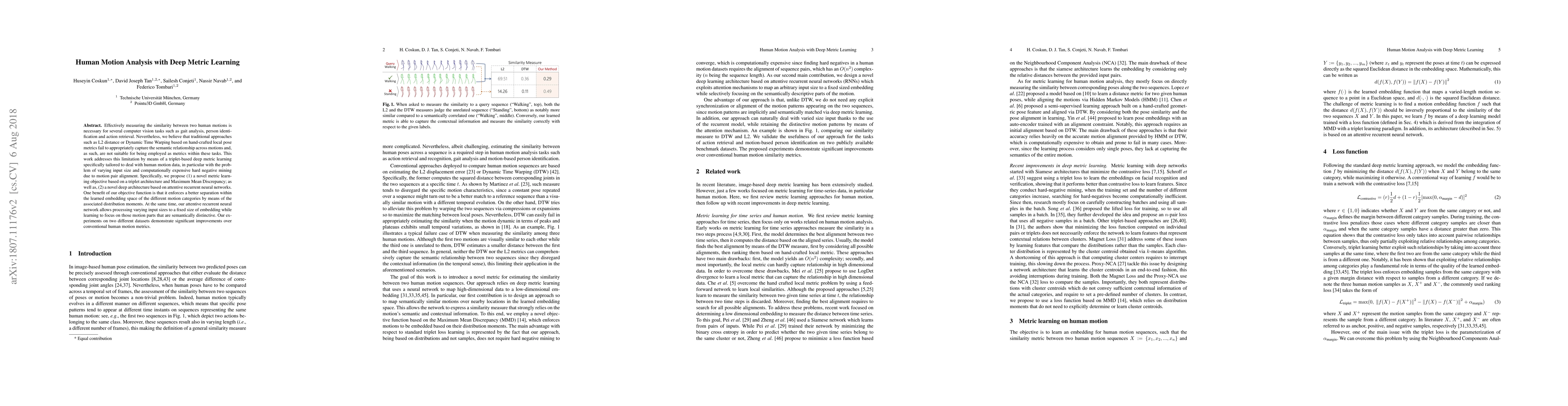 This paper proposes a novel deep metric learning approach for human motion analysis, utilizing a triplet-based objective with Maximum Mean Discrepancy and an attentive recurrent neural network to handle varying input sizes and improve semantic separation. Experiments show significant improvements over traditional metrics in gait analysis and person identification tasks.
