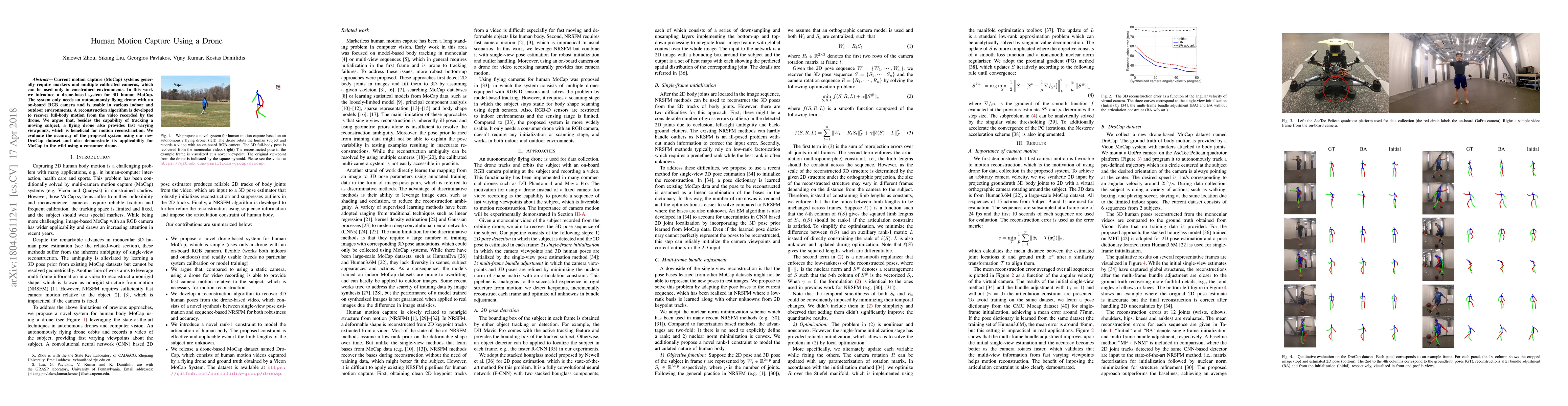 This paper presents a drone-based system for capturing 3D human motion using only an autonomously flying drone with an on-board RGB camera, enabling motion capture in diverse environments without the need for markers or multiple calibrated cameras. The system's accuracy is evaluated using a new dataset and demonstrated to be effective for capturing motion in real-world scenarios.