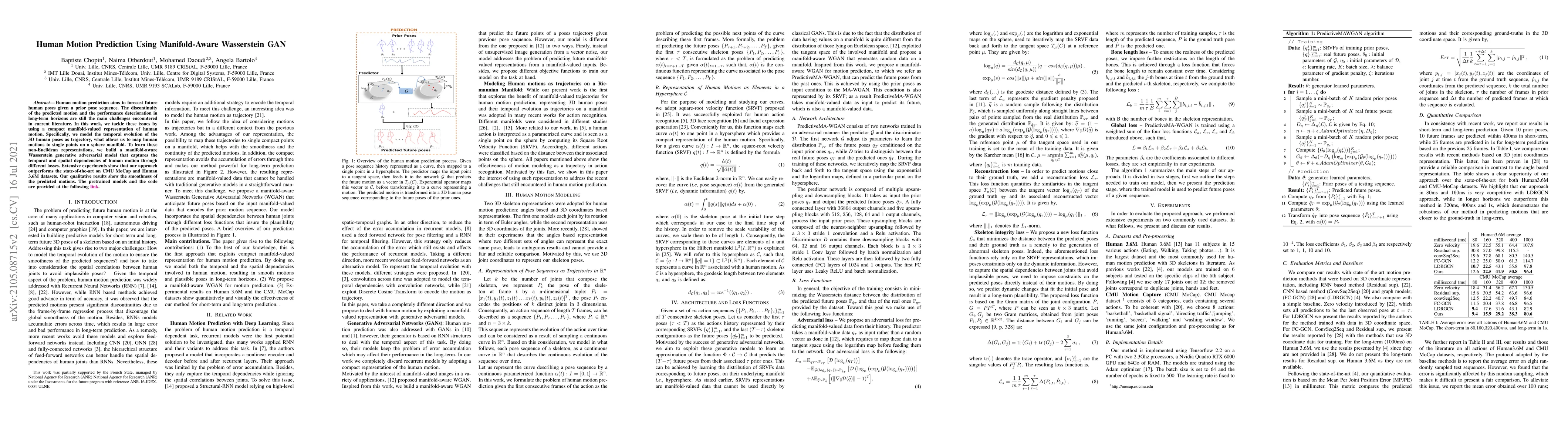 This paper proposes a manifold-aware Wasserstein GAN to predict human motion by mapping 3D poses to a sphere manifold, addressing discontinuity and long-term prediction issues. The model outperforms existing methods, demonstrating smoother motion predictions on CMU MoCap and Human 3.6M datasets.
