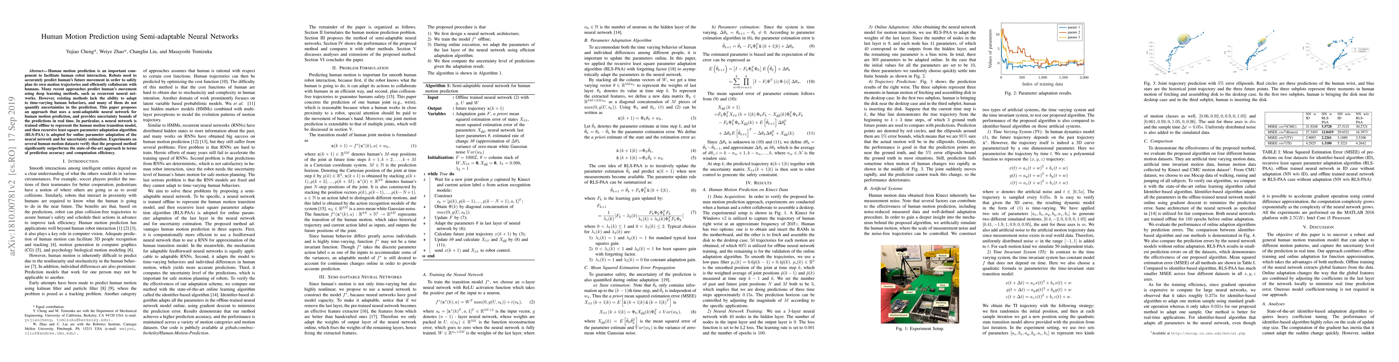 This paper proposes a semi-adaptable neural network for human motion prediction that incorporates real-time parameter adaptation and uncertainty quantification, significantly improving prediction accuracy and efficiency compared to existing methods. The approach uses a recursive least square parameter adaptation algorithm for online adaptation and uncertainty estimation.