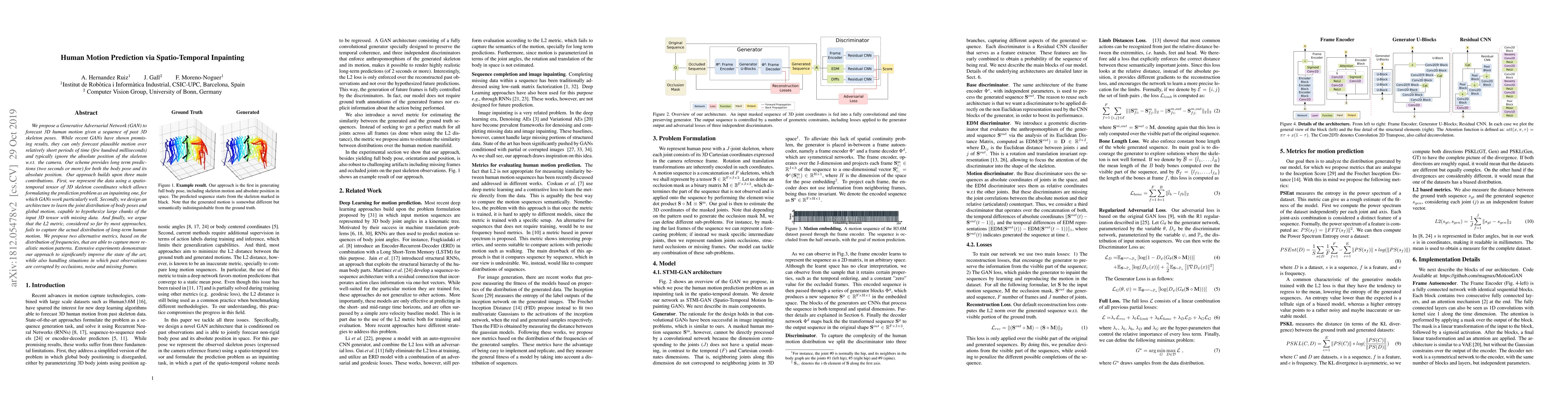 This paper proposes a GAN for long-term 3D human motion prediction using spatio-temporal inpainting, addressing limitations of short-term forecasts and absolute position tracking. It introduces new metrics based on frequency distribution for more realistic predictions.
