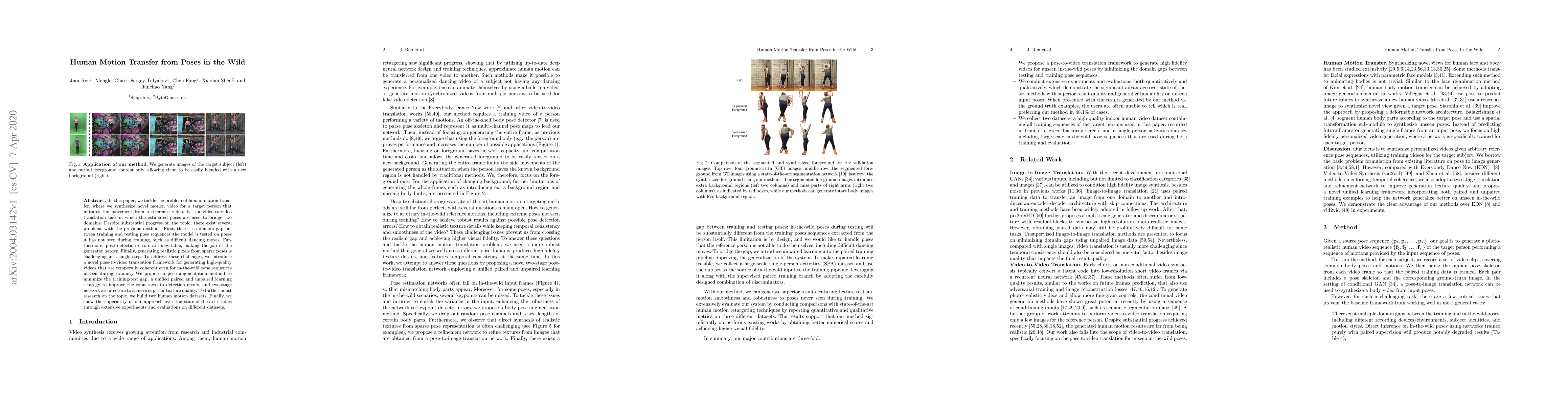 This paper introduces a novel framework for human motion transfer, addressing challenges such as domain gaps and pose detection errors to generate high-quality videos that are temporally coherent even with unseen poses.