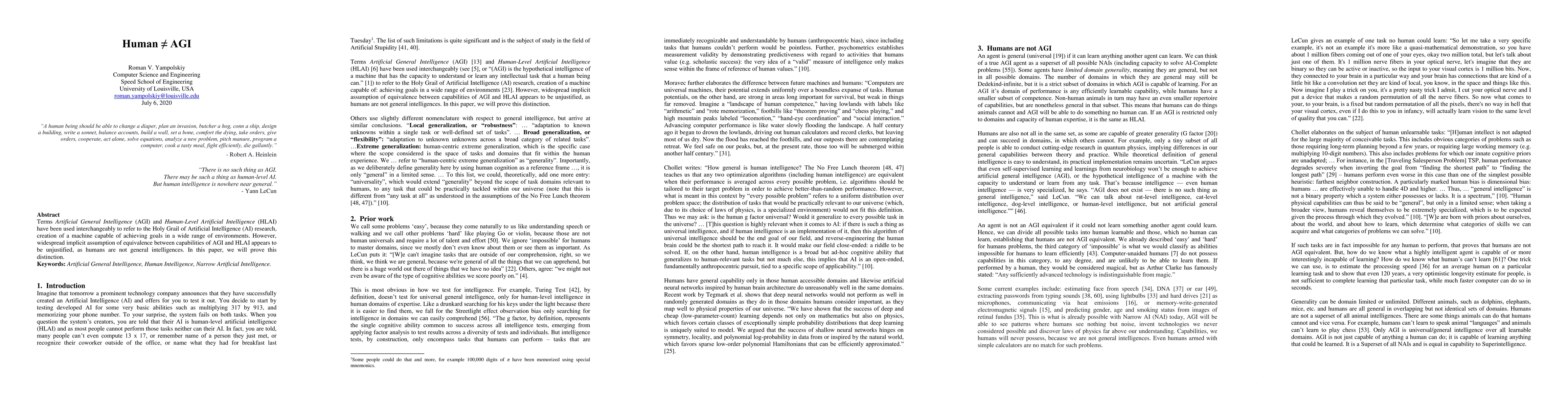 Terms Artificial General Intelligence (AGI) and Human-Level Artificial Intelligence (HLAI) have been used interchangeably to refer to the Holy Grail of Artificial Intelligence (AI) research, creation of a machine capable of achieving goals in a wide range of environments. However, widespread implicit assumption of equivalence between capabilities of AGI and HLAI appears to be unjustified, as humans are not general intelligences. In this paper, we will prove this distinction.