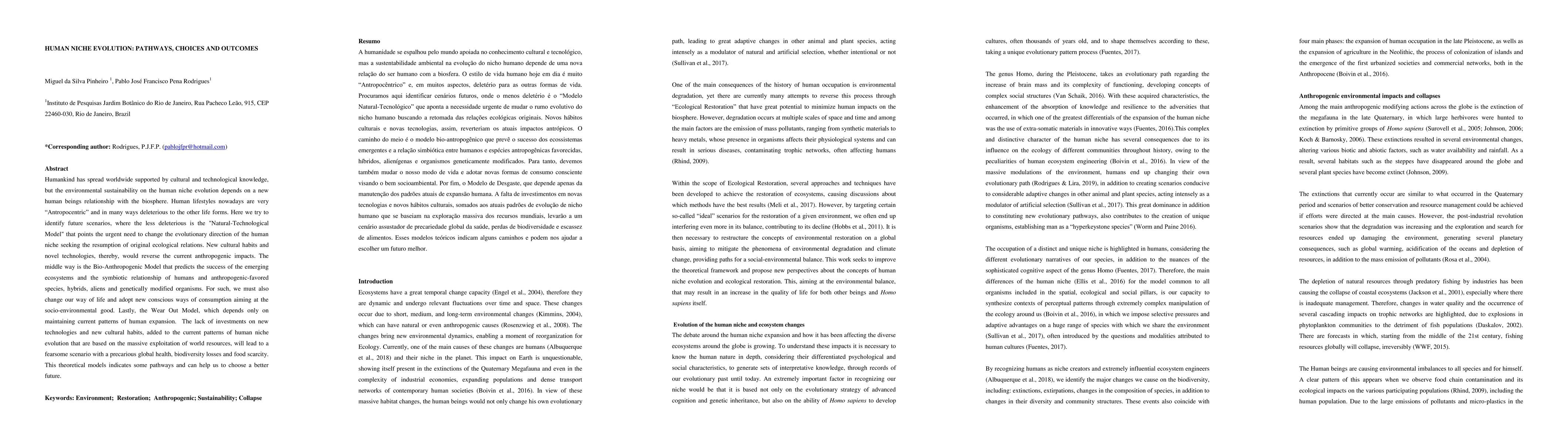 Humankind has spread worldwide supported by cultural and technological knowledge, but the environmental sustainability on the human niche evolution depends on a new human beings relationship with the biosphere. Human lifestyles nowadays are very Antropocentric and in many ways deleterious to the other life forms. Here we try to identify future scenarios, where the less deleterious is the Natural-Technological Model that points the urgent need to change the evolutionary direction of the human niche seeking the resumption of original ecological relations. New cultural habits and novel technologies, thereby, would reverse the current anthropogenic impacts. The middle way is the Bio-Anthropogenic Model that predicts the success of the emerging ecosystems and the symbiotic relationship of humans and anthropogenic-favored species, hybrids, aliens and genetically modified organisms. For such, we must also change our way of life and adopt new conscious ways of consumption aiming at the socio-environmental good. Lastly, the Wear Out Model, which depends only on maintaining current patterns of human expansion. The lack of investments on new technologies and new cultural habits, added to the current patterns of human niche evolution that are based on the massive exploitation of world resources, will lead to a fearsome scenario with a precarious global health, biodiversity losses and food scarcity. This theoretical models indicates some pathways and can help us to choose a better future.