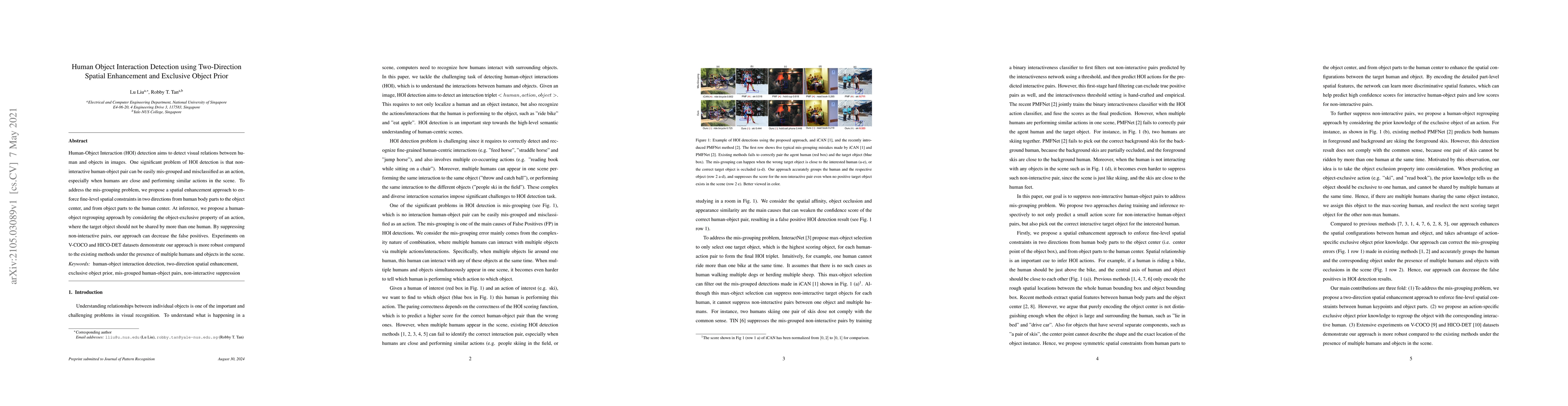 This paper proposes a method for Human-Object Interaction detection that uses spatial enhancement to enforce fine-level spatial constraints and an exclusive object prior to reduce misclassifications. Experiments show improved robustness compared to existing methods, especially in scenes with multiple humans and objects.