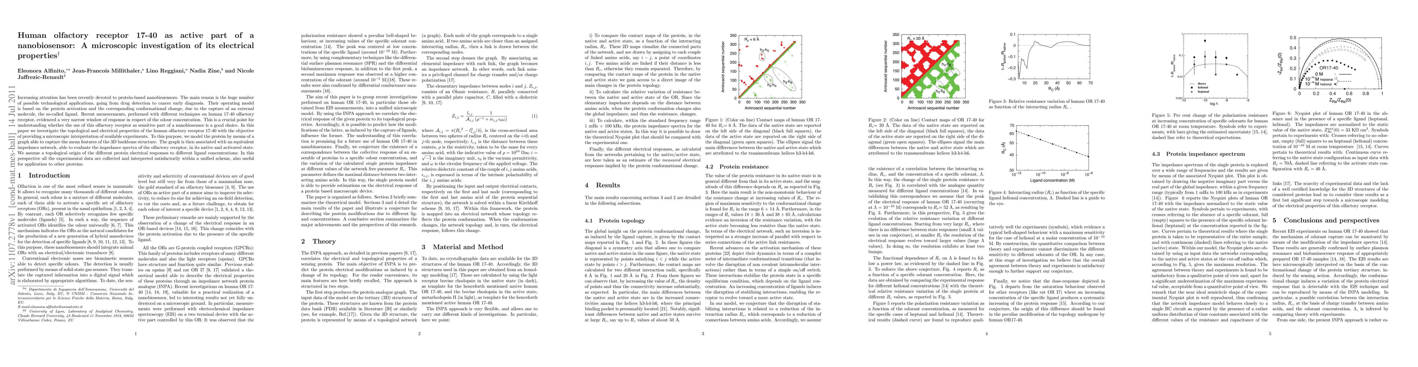 This paper investigates the electrical properties of the human olfactory receptor 17-40 to understand its potential as part of a nanobiosensor. The study models the protein as a graph and uses an equivalent impedance network to analyze its response to different ligand concentrations, providing a microscopic interpretation of its activation and conformational changes.