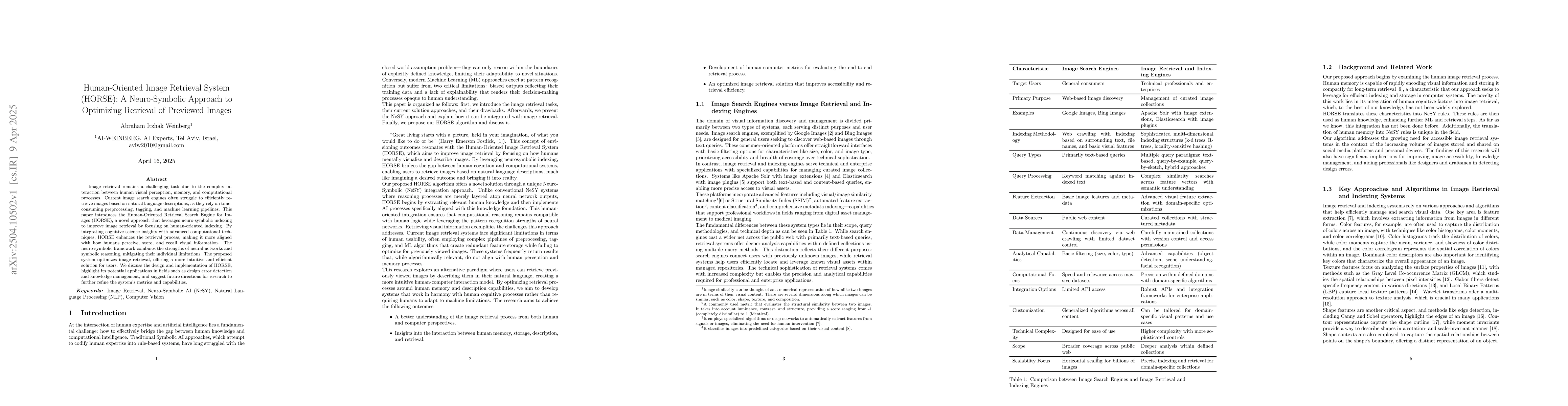 The paper presents HORSE, a neuro-symbolic image retrieval system that combines cognitive science with computational techniques to improve retrieval efficiency. HORSE optimizes image search by aligning with human visual perception and memory, offering a more intuitive solution for users in areas like design and knowledge management.