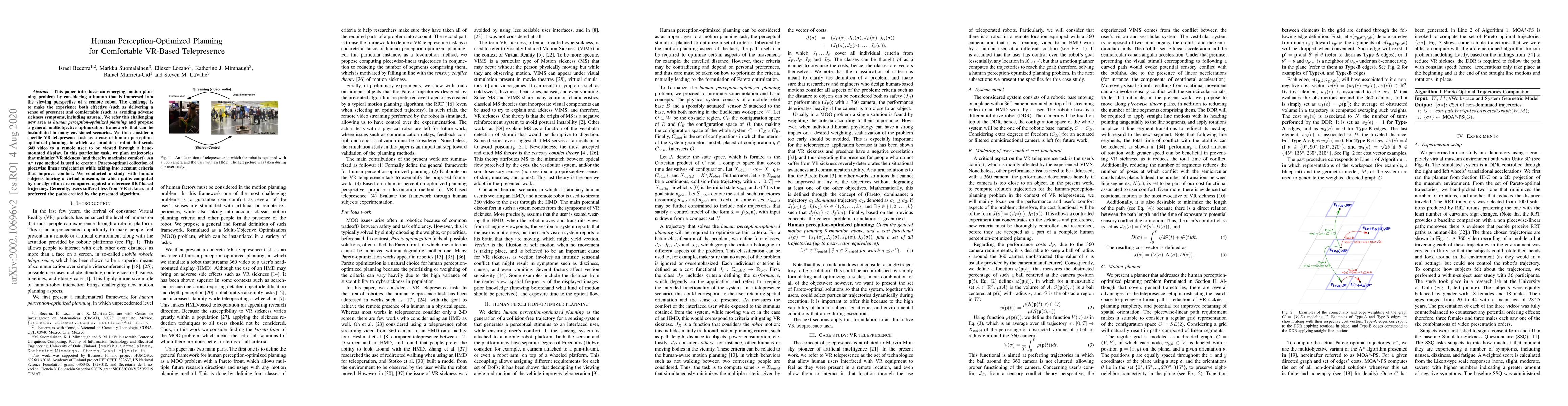 This paper introduces an emerging motion planning problem by considering a human that is immersed into the viewing perspective of a remote robot. The challenge is to make the experience both effective (such as delivering a sense of presence) and comfortable (such as avoiding adverse sickness symptoms, including nausea). We refer to this challenging new area as human perception-optimized planning and propose a general multiobjective optimization framework that can be instantiated in many envisioned scenarios. We then consider a specific VR telepresence task as a case of human perception-optimized planning, in which we simulate a robot that sends 360 video to a remote user to be viewed through a head-mounted display. In this particular task, we plan trajectories that minimize VR sickness (and thereby maximize comfort). An A* type method is used to create a Pareto-optimal collection of piecewise linear trajectories while taking into account criteria that improve comfort. We conducted a study with human subjects touring a virtual museum, in which paths computed by our algorithm are compared against a reference RRT-based trajectory. Generally, users suffered less from VR sickness and preferred the paths created by the presented algorithm.