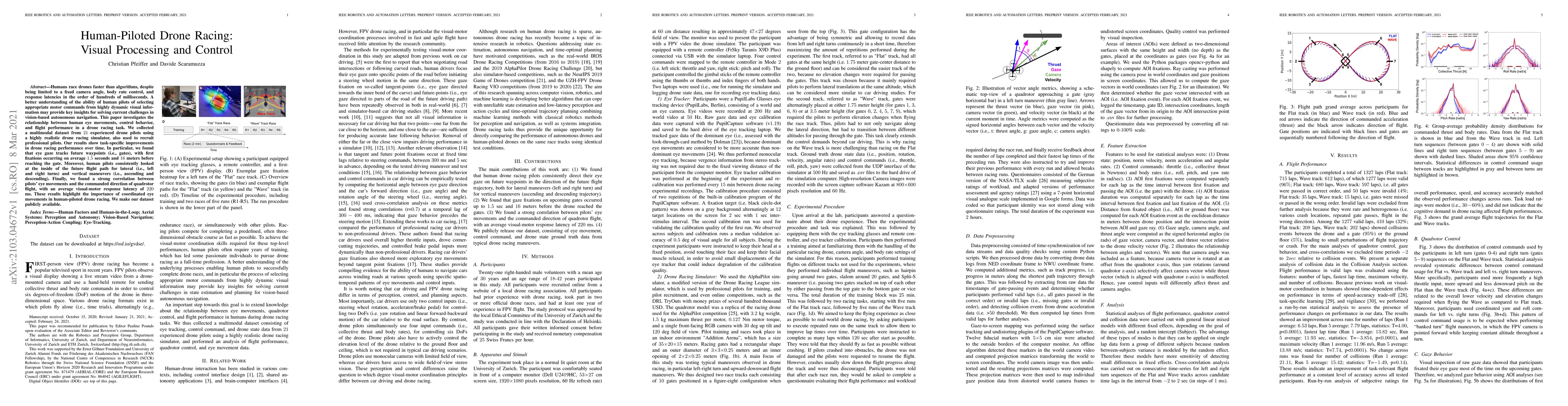Humans race drones faster than algorithms, despite being limited to a fixed camera angle, body rate control, and response latencies in the order of hundreds of milliseconds. A better understanding of the ability of human pilots of selecting appropriate motor commands from highly dynamic visual information may provide key insights for solving current challenges in vision-based autonomous navigation. This paper investigates the relationship between human eye movements, control behavior, and flight performance in a drone racing task. We collected a multimodal dataset from 21 experienced drone pilots using a highly realistic drone racing simulator, also used to recruit professional pilots. Our results show task-specific improvements in drone racing performance over time. In particular, we found that eye gaze tracks future waypoints (i.e., gates), with first fixations occurring on average 1.5 seconds and 16 meters before reaching the gate. Moreover, human pilots consistently looked at the inside of the future flight path for lateral (i.e., left and right turns) and vertical maneuvers (i.e., ascending and descending). Finally, we found a strong correlation between pilots eye movements and the commanded direction of quadrotor flight, with an average visual-motor response latency of 220 ms. These results highlight the importance of coordinated eye movements in human-piloted drone racing. We make our dataset publicly available.