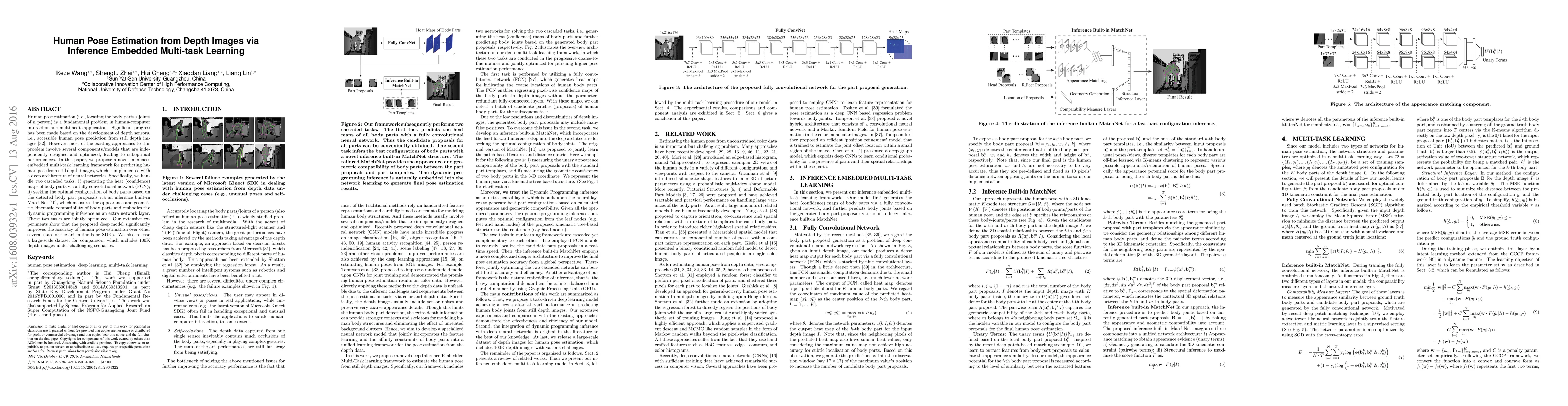 This paper proposes a novel multi-task learning framework for human pose estimation from depth images using a deep neural network architecture. It integrates two tasks: generating heat maps of body parts and optimizing body part configurations via an inference-embedded MatchNet, achieving superior performance over existing methods.