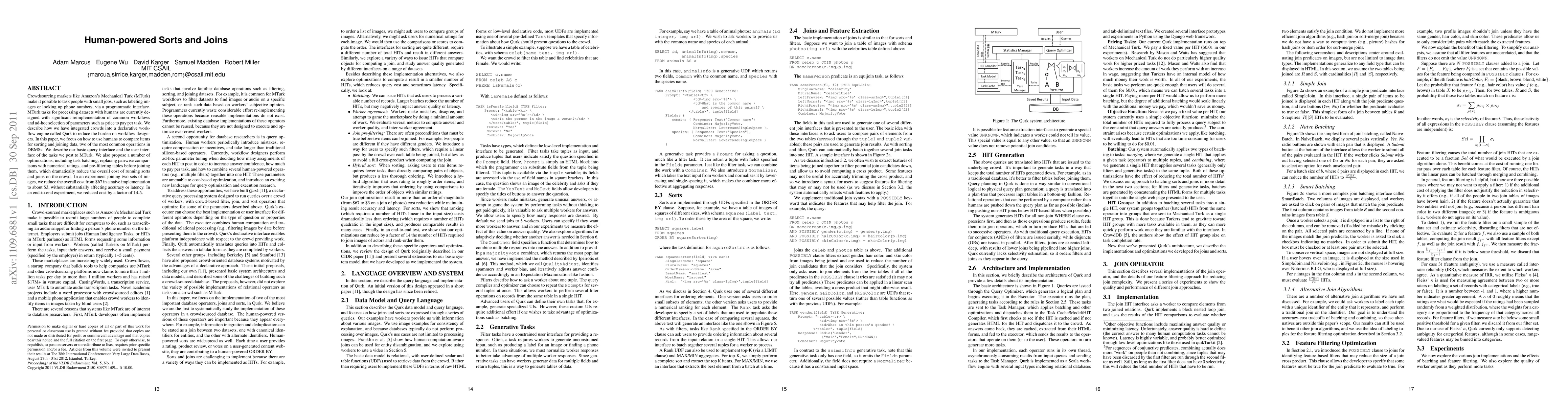 This paper explores integrating human workers from crowdsourcing platforms like Amazon's Mechanical Turk into a declarative workflow engine called Qurk to perform sorting and joining tasks, significantly reducing costs through optimizations such as task batching and pre-filtering. Experiments show substantial cost reductions, from $67 to $3 for image joining, without compromising accuracy or latency.