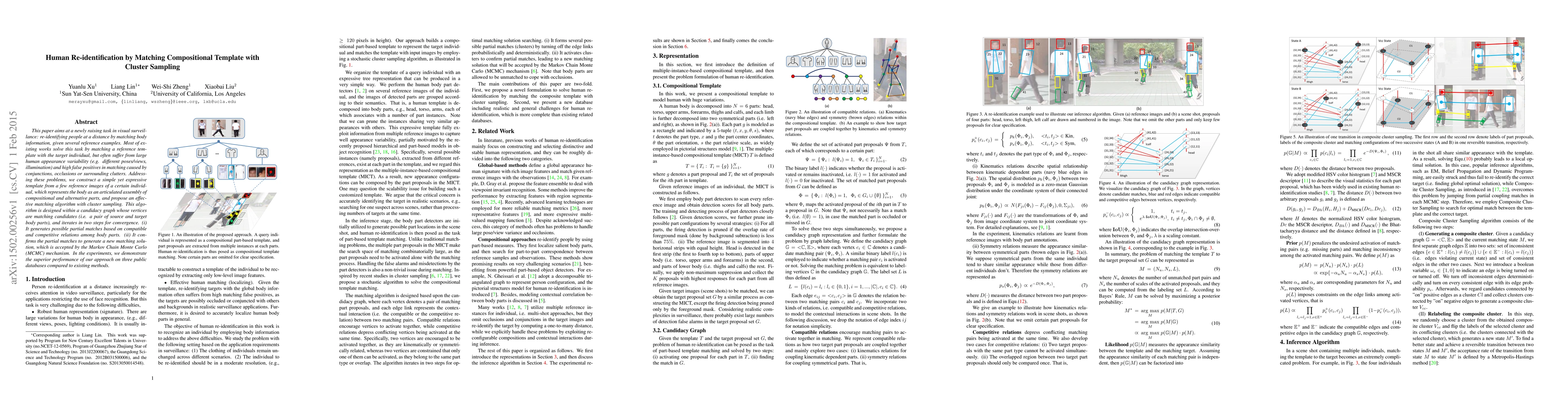 This paper aims at a newly raising task in visual surveillance: re-identifying people at a distance by matching body information, given several reference examples. Most of existing works solve this task by matching a reference template with the target individual, but often suffer from large human appearance variability (e.g. different poses/views, illumination) and high false positives in matching caused by conjunctions, occlusions or surrounding clutters. Addressing these problems, we construct a simple yet expressive template from a few reference images of a certain individual, which represents the body as an articulated assembly of compositional and alternative parts, and propose an effective matching algorithm with cluster sampling. This algorithm is designed within a candidacy graph whose vertices are matching candidates (i.e. a pair of source and target body parts), and iterates in two steps for convergence. (i) It generates possible partial matches based on compatible and competitive relations among body parts. (ii) It confirms the partial matches to generate a new matching solution, which is accepted by the Markov Chain Monte Carlo (MCMC) mechanism. In the experiments, we demonstrate the superior performance of our approach on three public databases compared to existing methods.