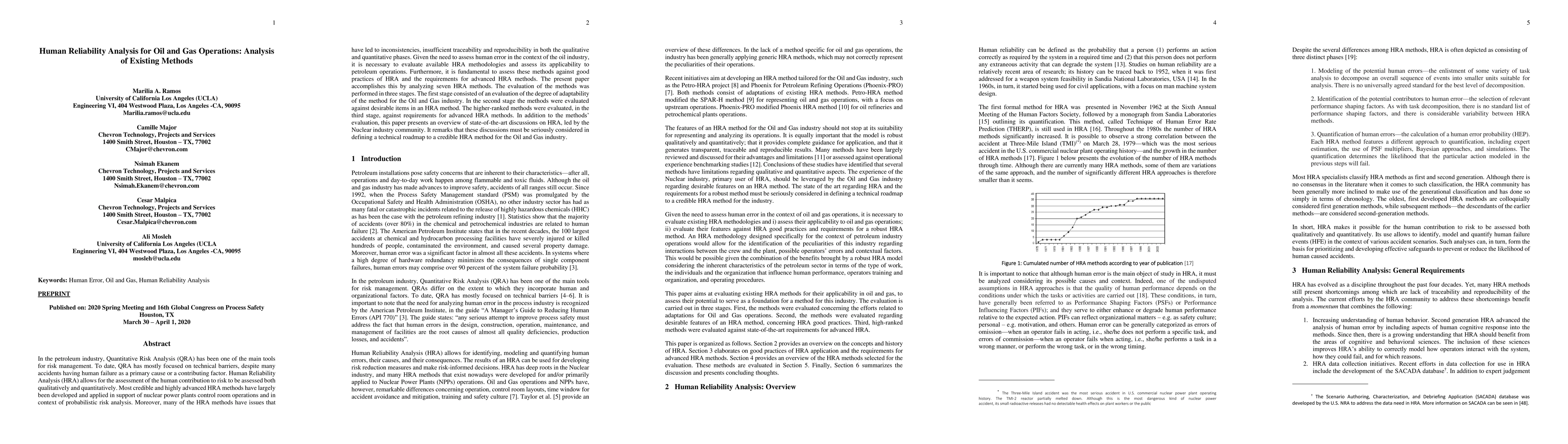 This paper evaluates existing Human Reliability Analysis (HRA) methods for oil and gas operations, assessing their adaptability, desirable items, and alignment with advanced HRA requirements. It presents key findings on the state-of-the-art discussions in the nuclear industry community as a basis for defining a technical roadmap for credible HRA methods in the oil and gas industry.