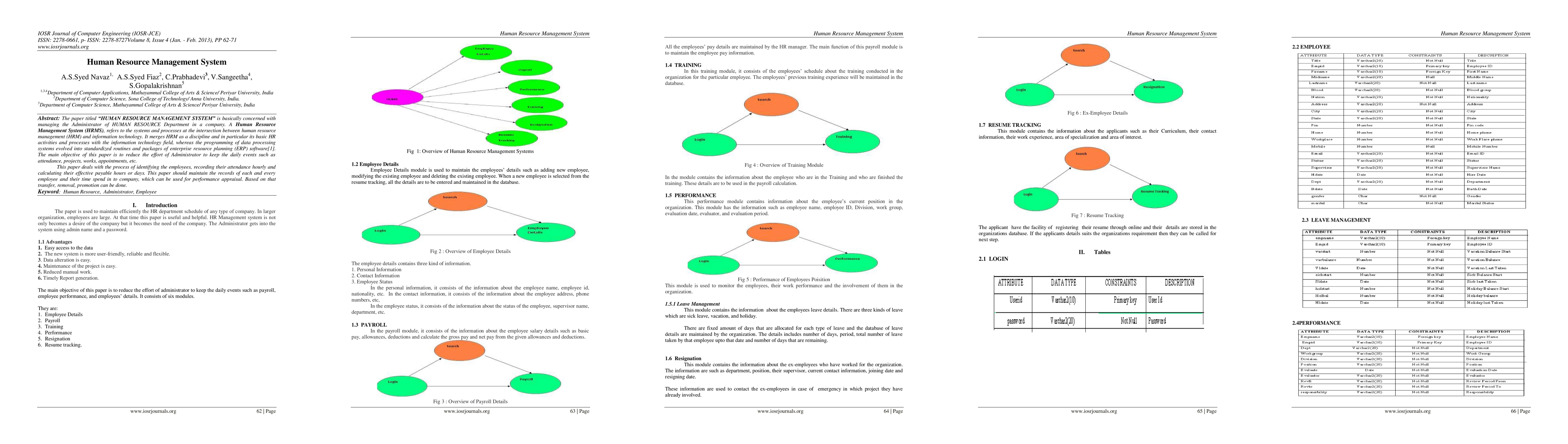 This paper proposes a Human Resource Management System to streamline HR processes, including attendance tracking and employee record-keeping, to improve efficiency and performance appraisal. It aims to reduce administrative effort and enable data-driven decision-making for employee management.