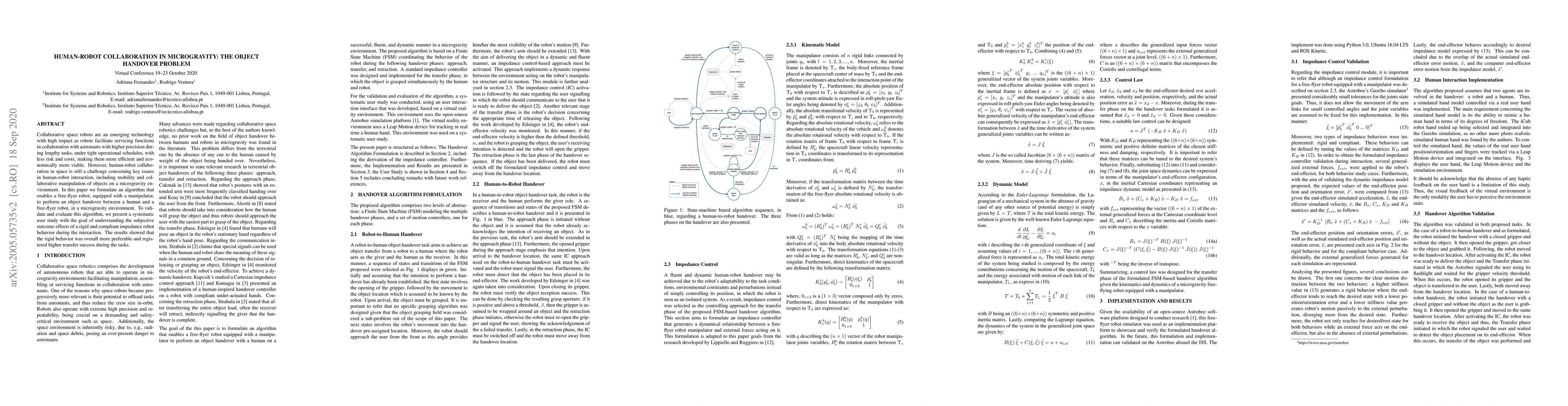 A free-flier robot was designed to perform object handovers with a human in a microgravity environment using a finite state machine (FSM) and an impedance controller.