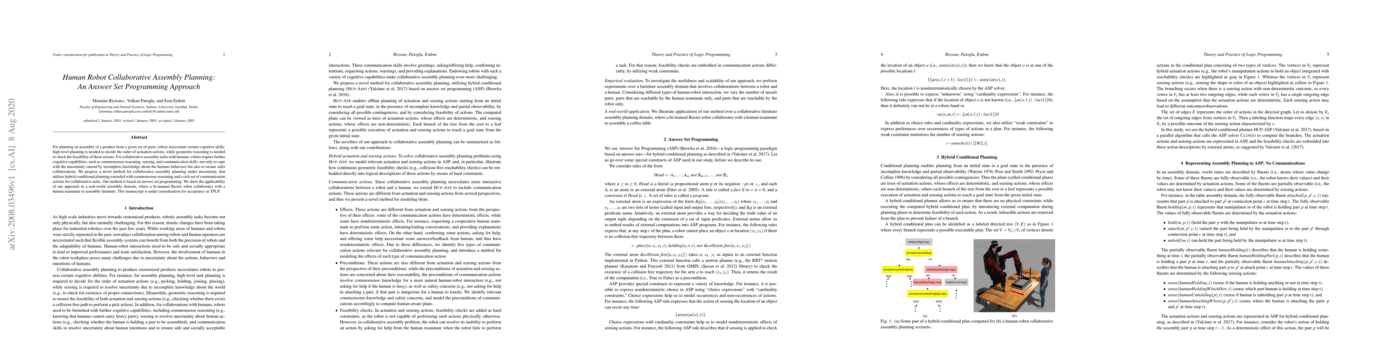 This paper proposes a novel method for collaborative assembly planning using answer set programming, integrating commonsense reasoning and communication actions to handle uncertainties in human-robot interactions. The approach is demonstrated in a real-world scenario where a Baxter robot collaborates with a human to assemble furniture.