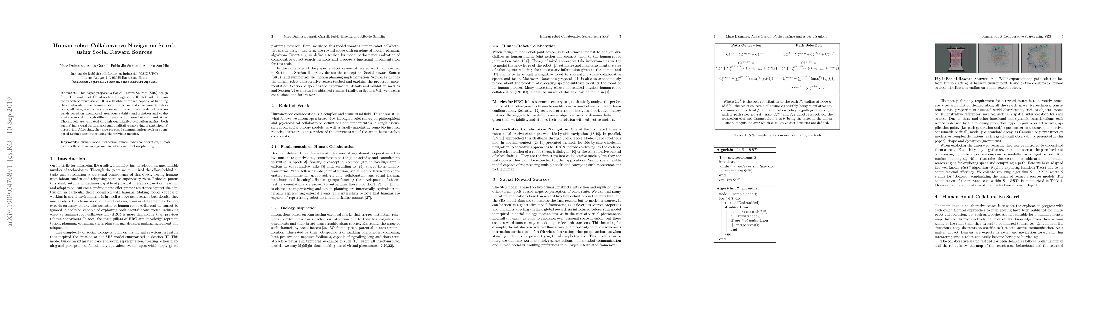 This paper introduces a Social Reward Sources (SRS) design for Human-Robot Collaborative Navigation search, integrating task handling, interaction, and environment constraints. The proposed model is evaluated through quantitative and qualitative assessments, and communication levels are compared based on performance metrics and participant perceptions.