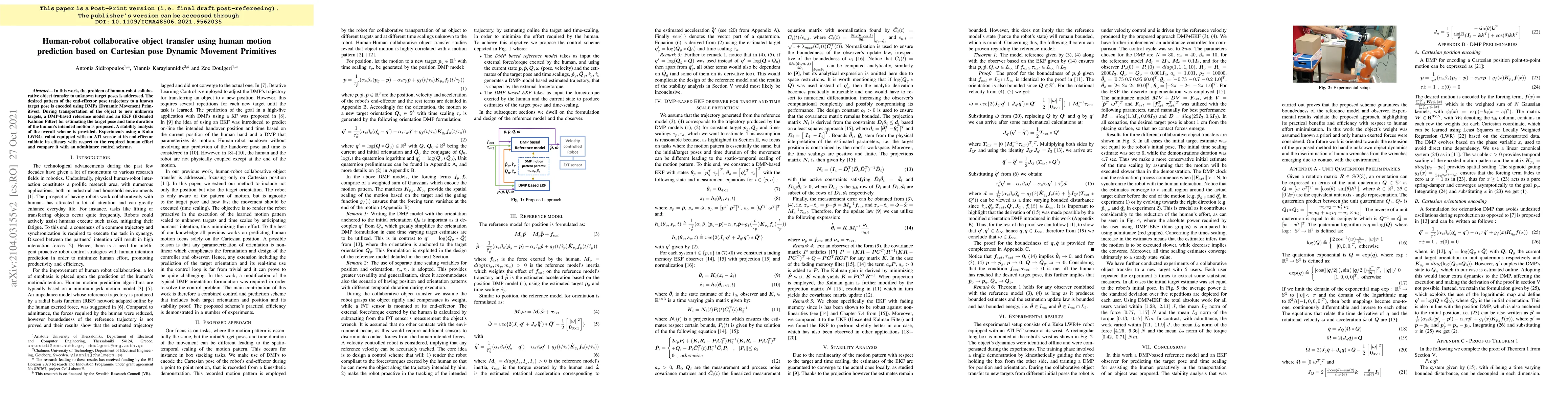 This paper proposes a method for human-robot collaboration in object transfer using Cartesian pose Dynamic Movement Primitives (DMPs) and an Extended Kalman Filter (EKF) to predict human motion for unknown target poses. Experiments with a Kuka LWR4+ robot demonstrate the method's effectiveness compared to an admittance control scheme.