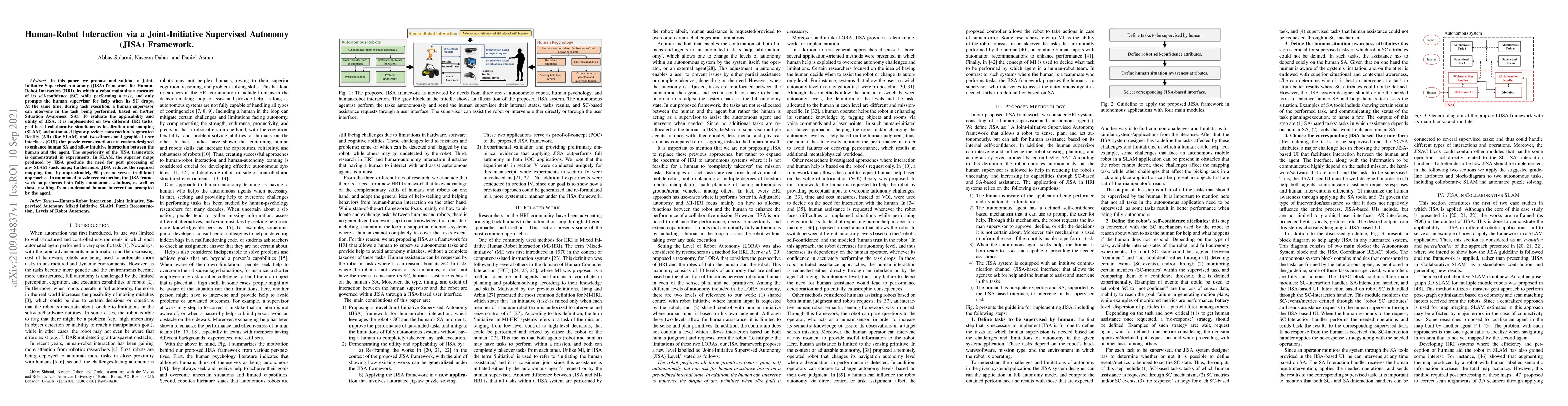 In this paper, we propose and validate a Joint-Initiative Supervised Autonomy (JISA) framework for Human-Robot Interaction (HRI), in which a robot maintains a measure of its self-confidence (SC) while performing a task, and only prompts the human supervisor for help when its SC drops. At the same time, during task execution, a human supervisor can intervene in the task being performed, based on his/her Situation Awareness (SA). To evaluate the applicability and utility of JISA, it is implemented on two different HRI tasks: grid-based collaborative simultaneous localization and mapping (SLAM) and automated jigsaw puzzle reconstruction. Augmented Reality (AR) (for SLAM) and two-dimensional graphical user interfaces (GUI) (for puzzle reconstruction) are custom-designed to enhance human SA and allow intuitive interaction between the human and the agent. The superiority of the JISA framework is demonstrated in experiments. In SLAM, the superior maps produced by JISA preclude the need for post processing of any SLAM stock maps; furthermore, JISA reduces the required mapping time by approximately 50 percent versus traditional approaches. In automated puzzle reconstruction, the JISA framework outperforms both fully autonomous solutions, as well as those resulting from on-demand human intervention prompted by the agent.