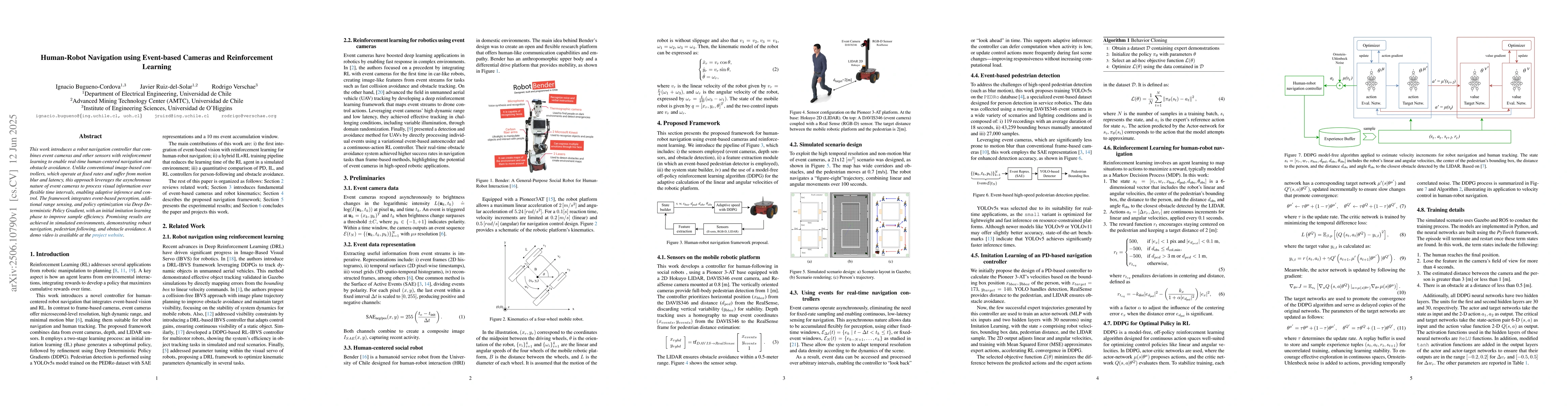 The integration of event cameras with reinforcement learning for adaptive, real-time human-robot navigation, utilizing event-based perception, depth, and LIDAR data.