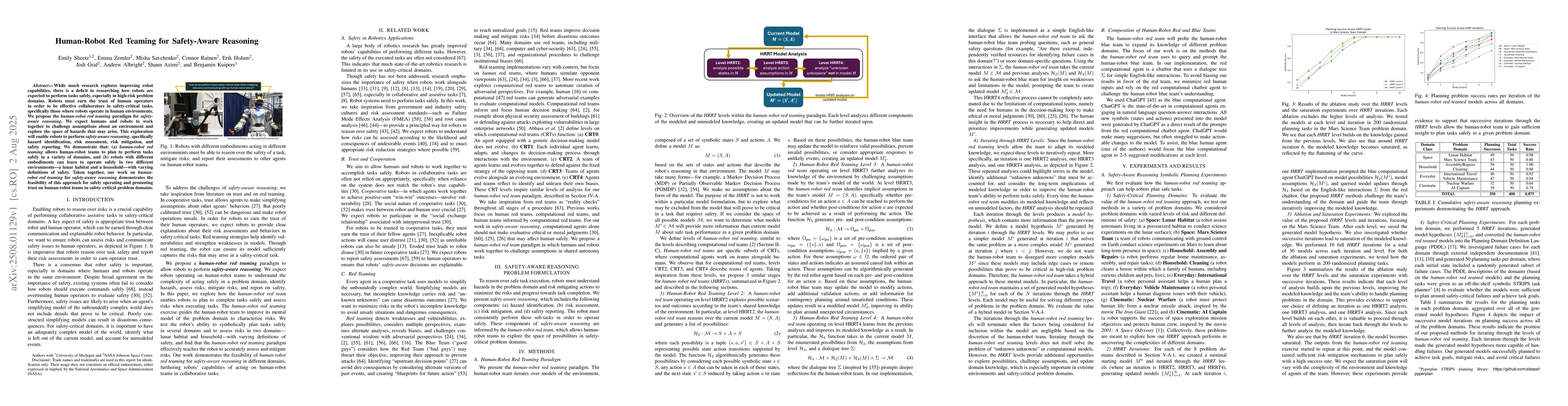 While much research explores improving robot capabilities, there is a deficit in researching how robots are expected to perform tasks safely, especially in high-risk problem domains. Robots must earn the trust of human operators in order to be effective collaborators in safety-critical tasks, specifically those where robots operate in human environments. We propose the human-robot red teaming paradigm for safety-aware reasoning. We expect humans and robots to work together to challenge assumptions about an environment and explore the space of hazards that may arise. This exploration will enable robots to perform safety-aware reasoning, specifically hazard identification, risk assessment, risk mitigation, and safety reporting. We demonstrate that: (a) human-robot red teaming allows human-robot teams to plan to perform tasks safely in a variety of domains, and (b) robots with different embodiments can learn to operate safely in two different environments -- a lunar habitat and a household -- with varying definitions of safety. Taken together, our work on human-robot red teaming for safety-aware reasoning demonstrates the feasibility of this approach for safely operating and promoting trust on human-robot teams in safety-critical problem domains.