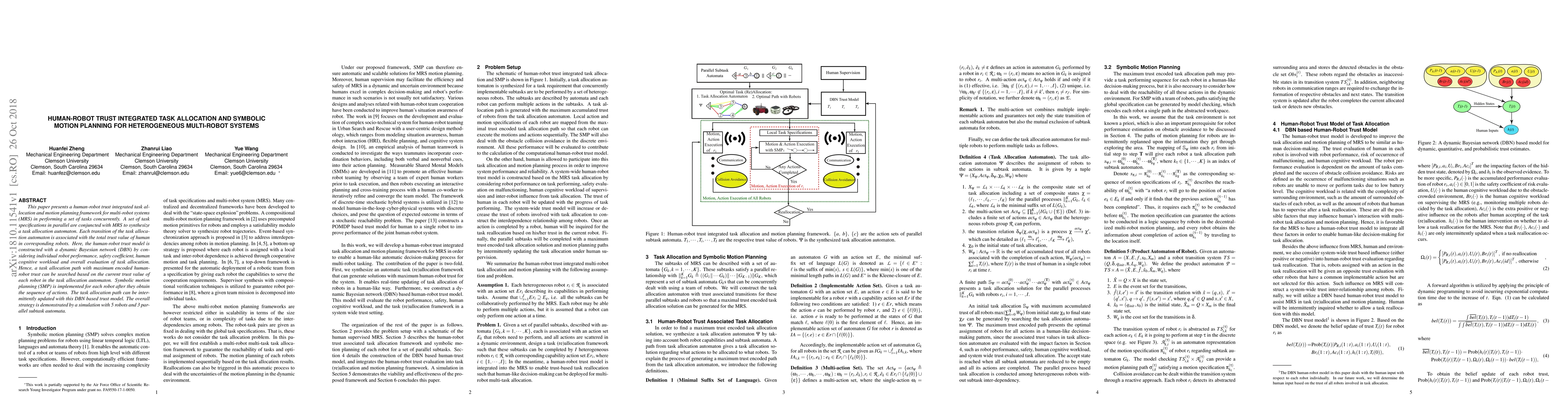 This paper proposes a framework for task allocation and symbolic motion planning in multi-robot systems, integrating human-robot trust through a dynamic Bayesian network. The trust model considers individual robot performance, safety, and human cognitive workload to optimize task allocation paths.