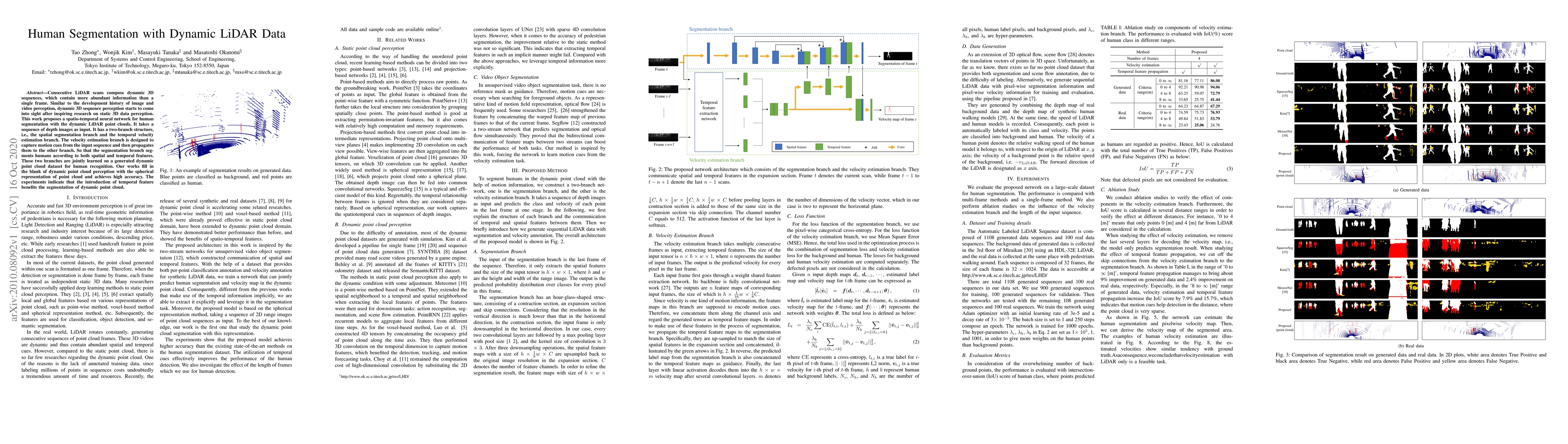 This paper proposes a spatio-temporal neural network for human segmentation using dynamic LiDAR data, employing a two-branch structure to integrate spatial and temporal features. The network achieves high accuracy by leveraging motion cues from LiDAR sequences to improve segmentation.