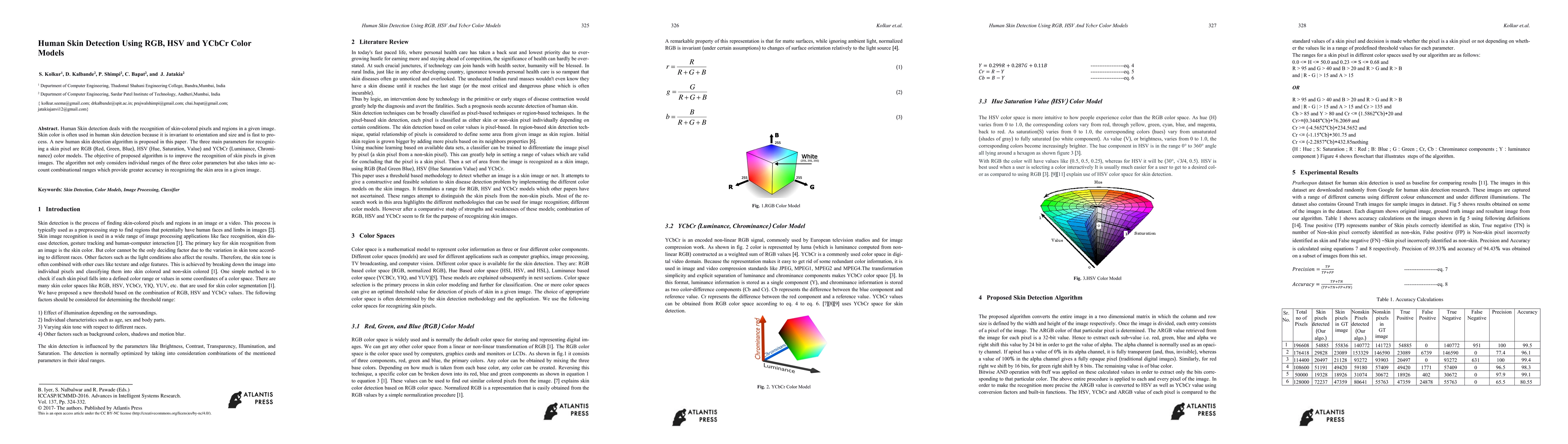 Human Skin detection deals with the recognition of skin-colored pixels and regions in a given image. Skin color is often used in human skin detection because it is invariant to orientation and size and is fast to process. A new human skin detection algorithm is proposed in this paper. The three main parameters for recognizing a skin pixel are RGB (Red, Green, Blue), HSV (Hue, Saturation, Value) and YCbCr (Luminance, Chrominance) color models. The objective of proposed algorithm is to improve the recognition of skin pixels in given images. The algorithm not only considers individual ranges of the three color parameters but also takes into ac- count combinational ranges which provide greater accuracy in recognizing the skin area in a given image.
