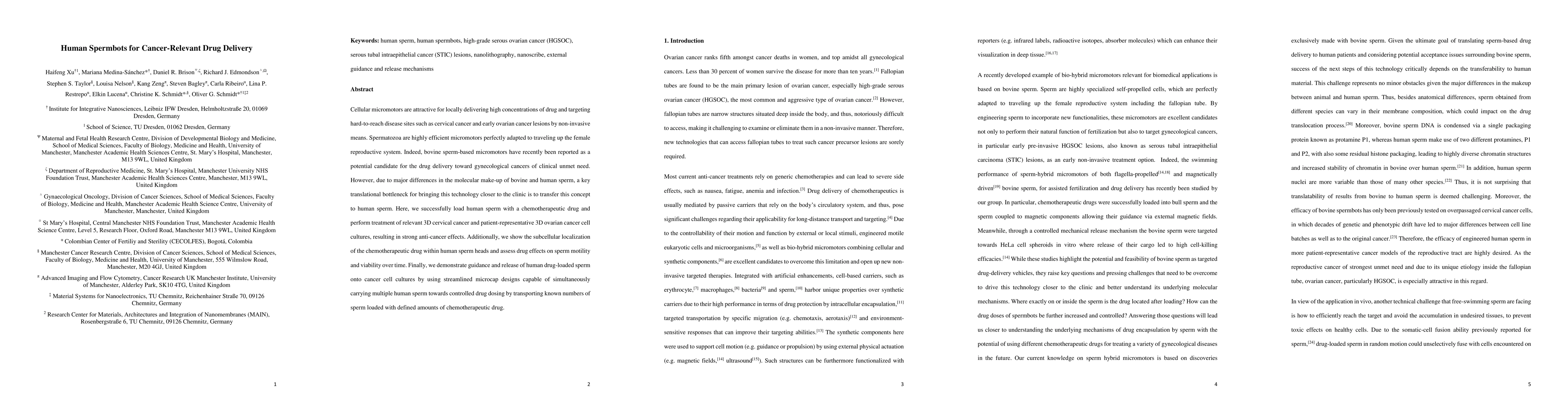 This paper demonstrates the successful loading of human sperm with chemotherapeutic drugs for targeted drug delivery to cervical and ovarian cancer cells, showing strong anti-cancer effects. It also assesses the impact on sperm motility and viability, and introduces microcap designs for controlled drug dosing.