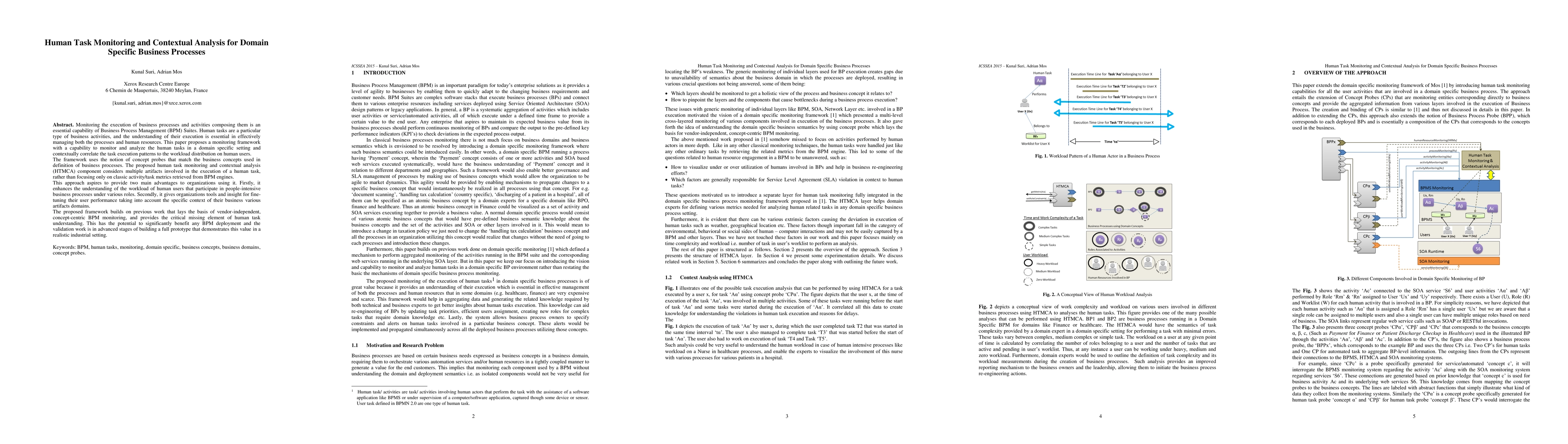 This paper proposes a framework for monitoring and analyzing human tasks within domain-specific business processes, aiming to contextually correlate task execution patterns with workload distribution among human users. The framework leverages concept probes and considers multiple execution artifacts, offering insights for optimizing human resource management and performance tuning.