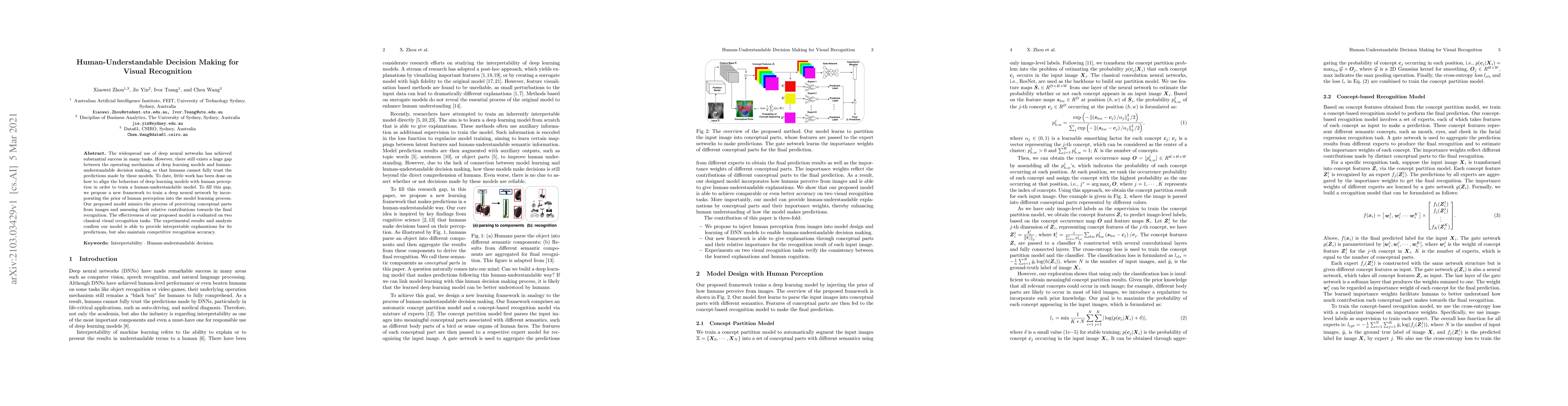 This paper proposes a framework to train deep neural networks that align with human perception, aiming to make their decision-making processes more understandable. The model mimics human recognition by identifying conceptual parts in images and their contributions, achieving competitive accuracy while providing interpretable explanations.