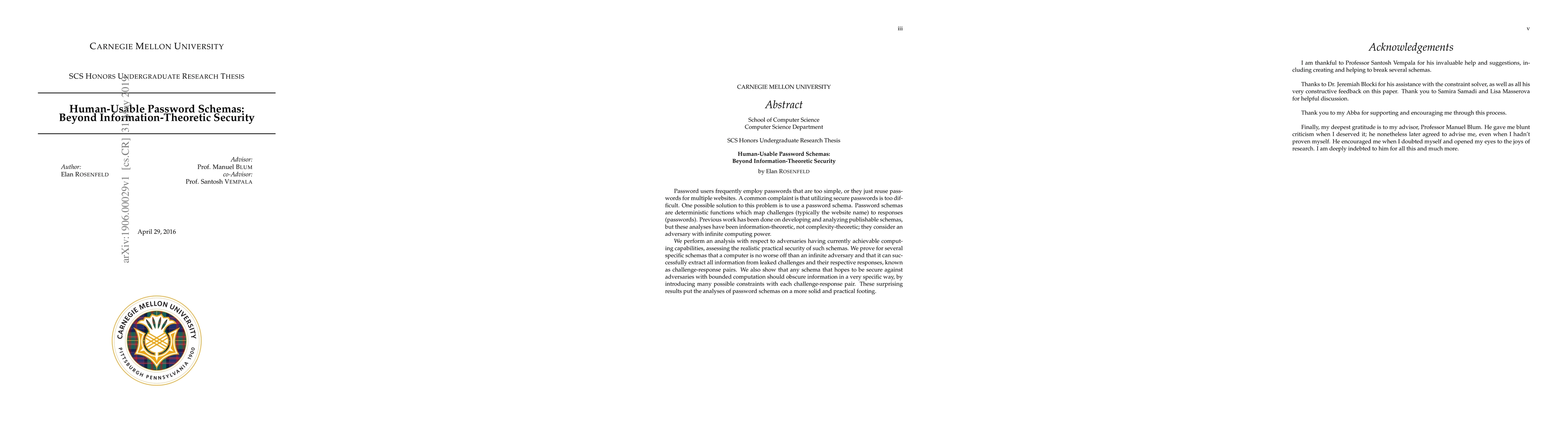 Password users frequently employ passwords that are too simple, or they just reuse passwords for multiple websites. A common complaint is that utilizing secure passwords is too difficult. One possible solution to this problem is to use a password schema. Password schemas are deterministic functions which map challenges (typically the website name) to responses (passwords). Previous work has been done on developing and analyzing publishable schemas, but these analyses have been information-theoretic, not complexity-theoretic; they consider an adversary with infinite computing power. We perform an analysis with respect to adversaries having currently achievable computing capabilities, assessing the realistic practical security of such schemas. We prove for several specific schemas that a computer is no worse off than an infinite adversary and that it can successfully extract all information from leaked challenges and their respective responses, known as challenge-response pairs. We also show that any schema that hopes to be secure against adversaries with bounded computation should obscure information in a very specific way, by introducing many possible constraints with each challenge-response pair. These surprising results put the analyses of password schemas on a more solid and practical footing.