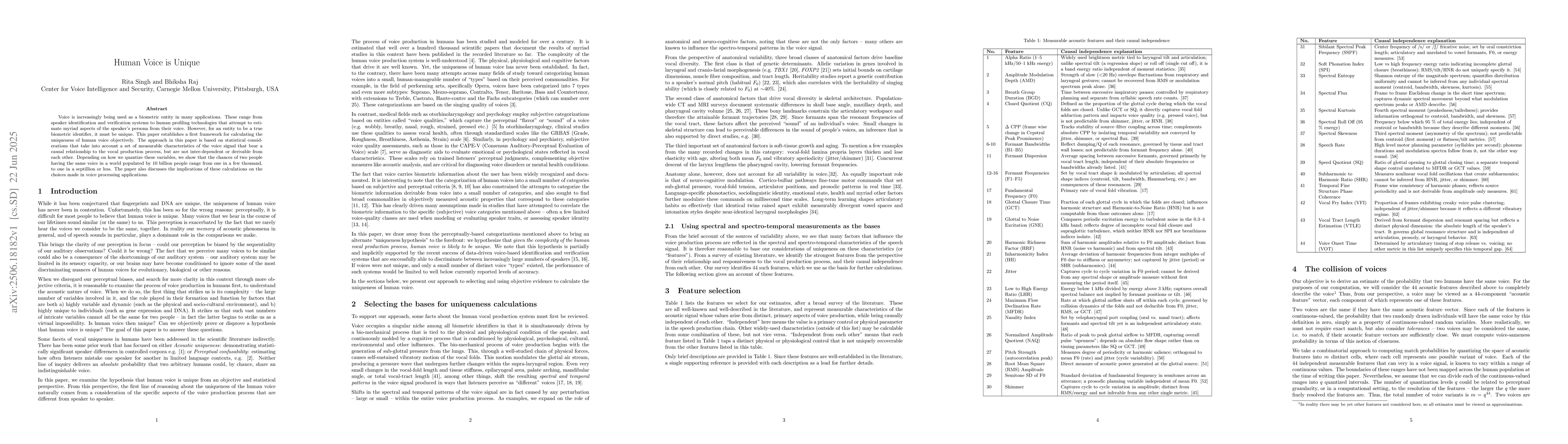 This research paper presents a framework to objectively measure the uniqueness of human voice, using statistical considerations of measurable voice characteristics. It concludes that the likelihood of two individuals having identical voices is extremely low, ranging from one in a few thousand to one in a septillion, depending on quantization methods. The findings have significant implications for voice-based biometric systems and voice processing applications.